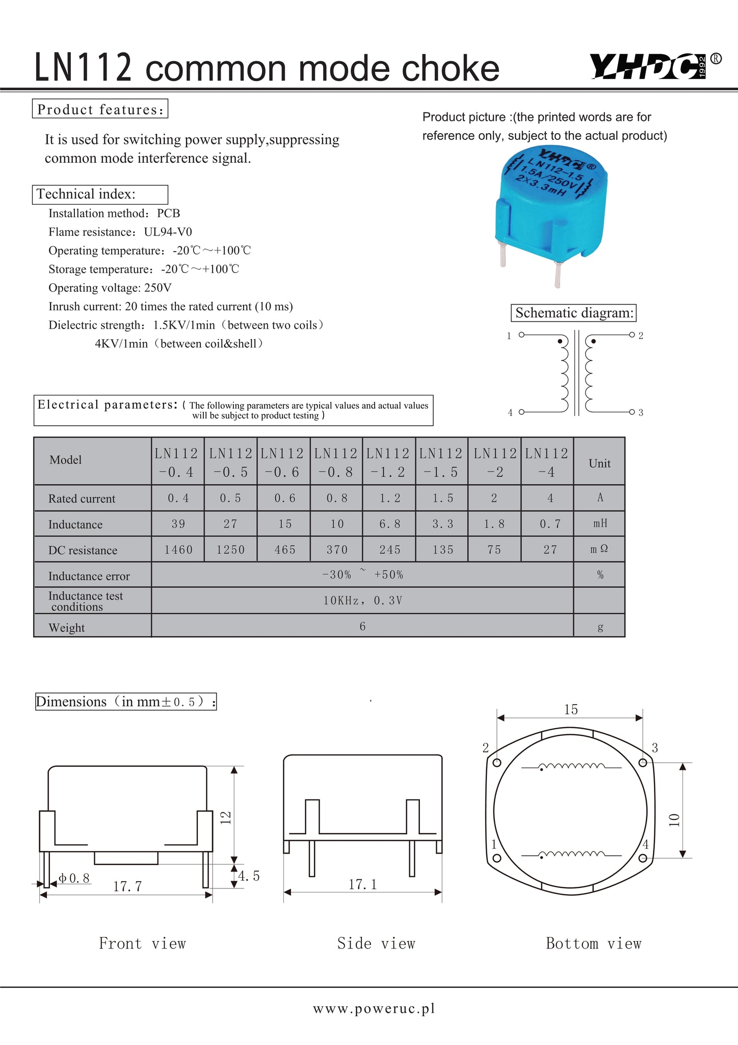 LN series common mode choke LN112 Rated current 0.4~4A 1460~27mΩ