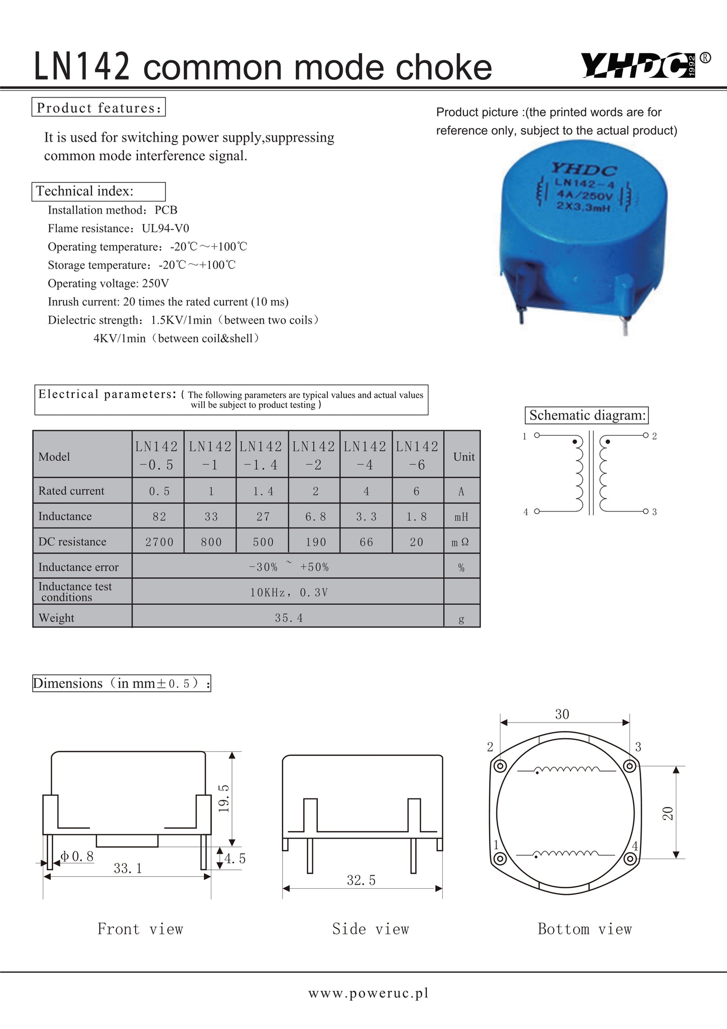 LN series common mode choke LN142 Rated current 0.5~6A DC resistance 2700~20mΩ