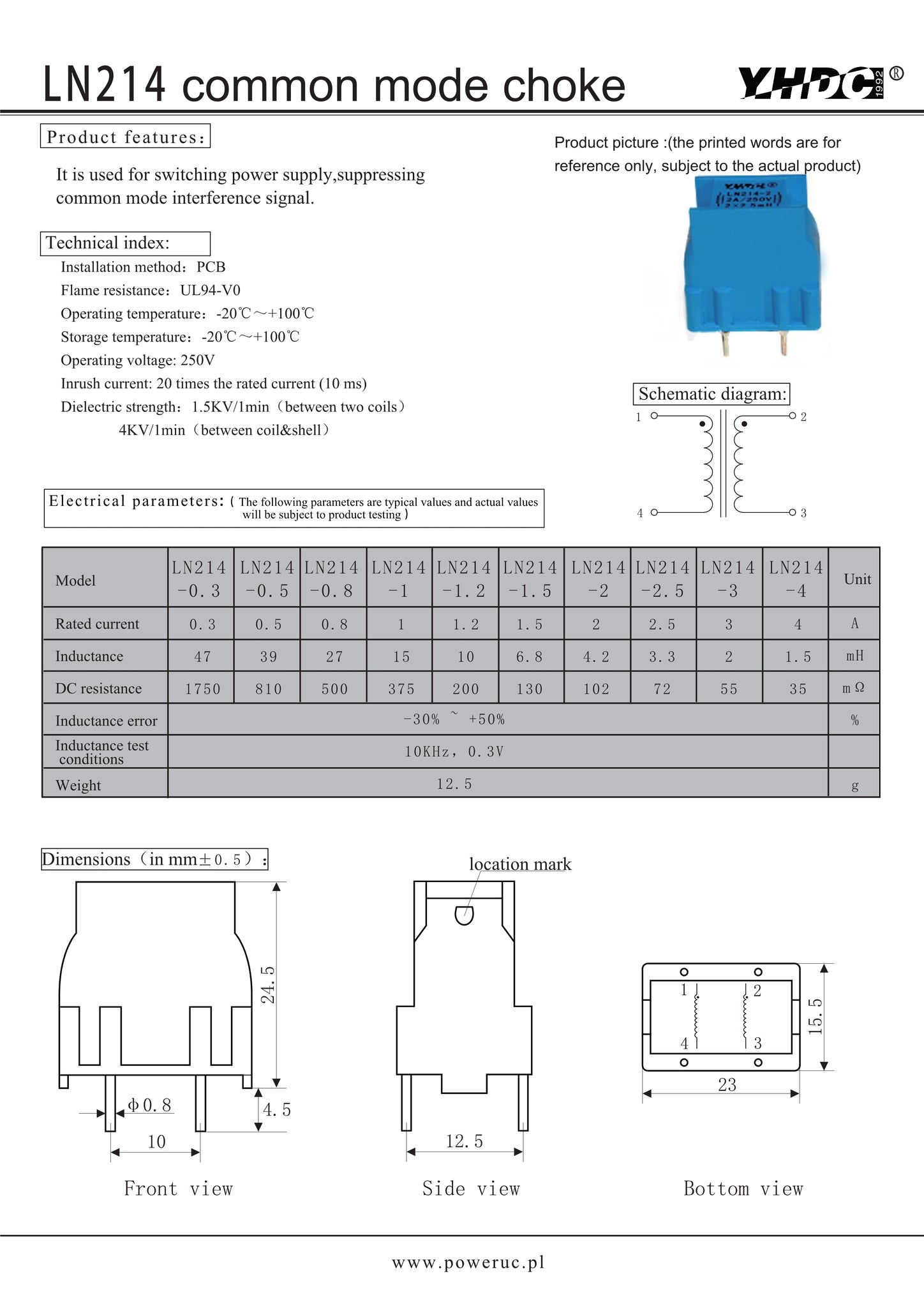 LN series common mode choke LN214 Rated current 0.3~4A DC resistance 1750~35mΩ