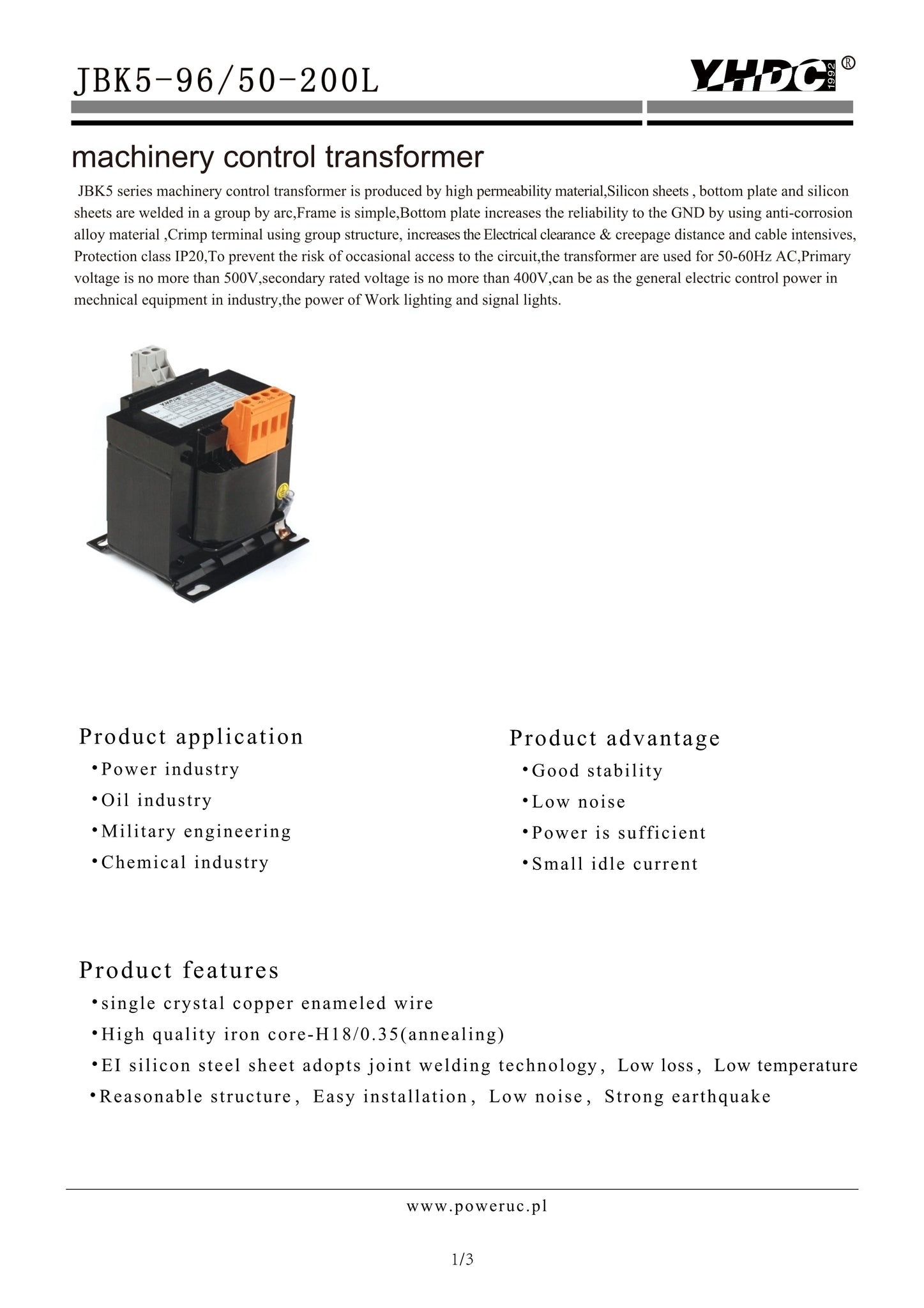 JBK5 series horizontal machinery control transformer is produced by high permeability material, silicon sheets, bottom plate and silicon sheets are welded in a group by arc, frame is simple, bottom plate increases the reliability to the GND by using anti-corrosion alloy material, crimp terminal using group structure, increases the electrical clearance & creepage distance and cable intensives, protection class IP20, to prevent the risk of occasional access to the circuit, the transformer are used for 50-60Hz AC, primary voltage is no more than 500V, secondary rated voltage is no more than 400V, can be as the general electric control power in mechanical equipment in industry, the power of work lighting and signal lights.