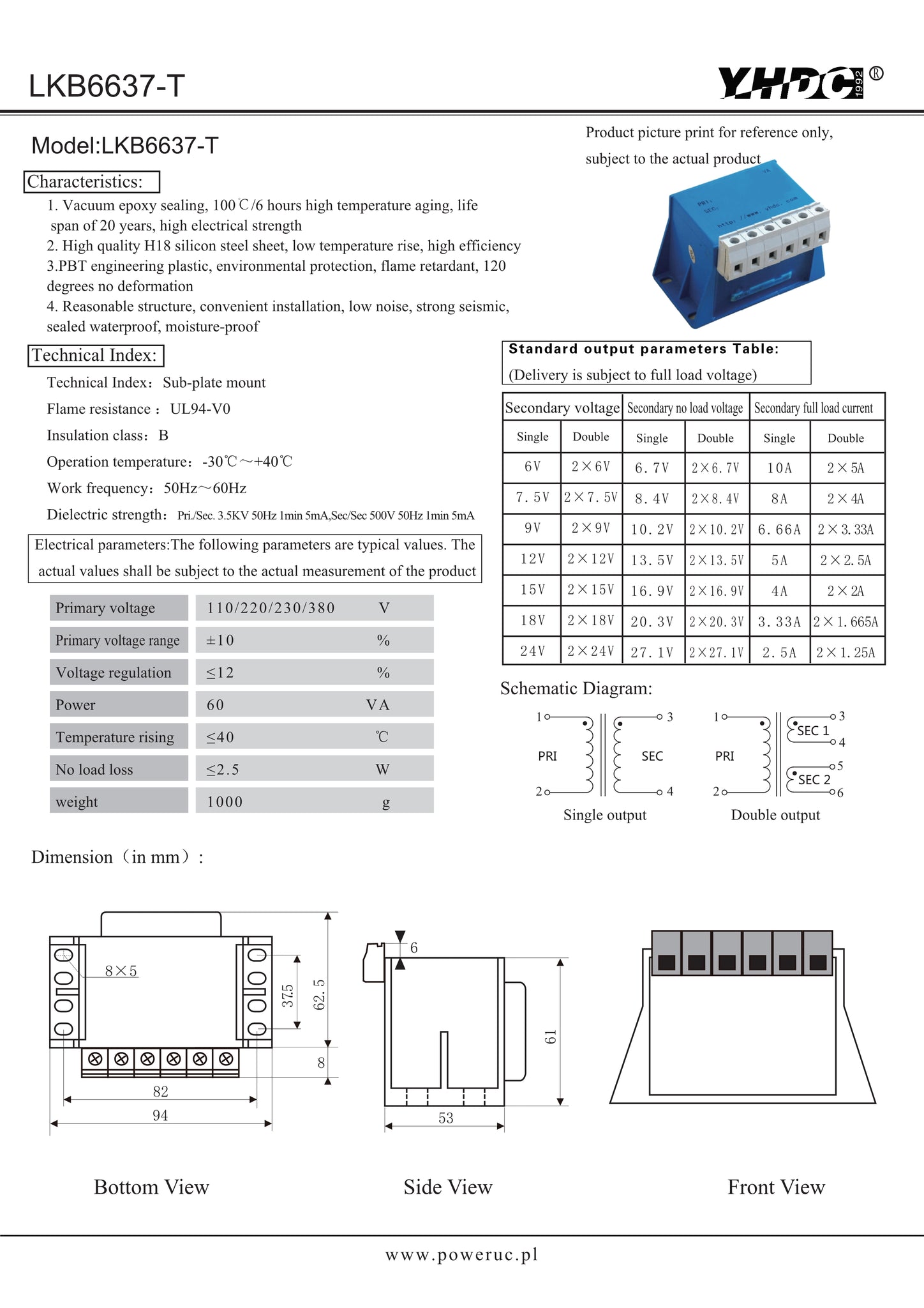 LKB series sub-plate mounting isolation transformer LKB6637-T 110V /220V / 230V /380V 60VA
