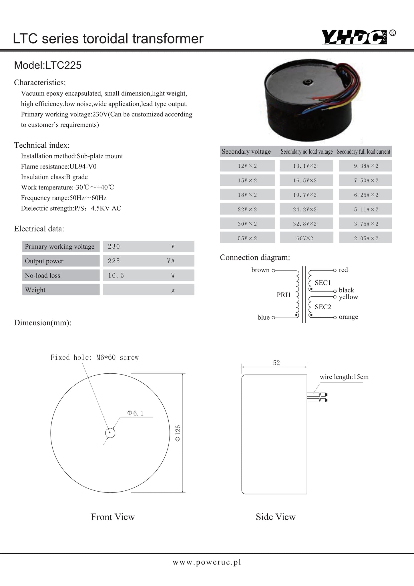 Vacuum epoxy encapsulated, small dimension, light weight, high efficiency, low noise, wide application, lead type output, primary working voltage: 230V (can be customized according to customer's requirements).