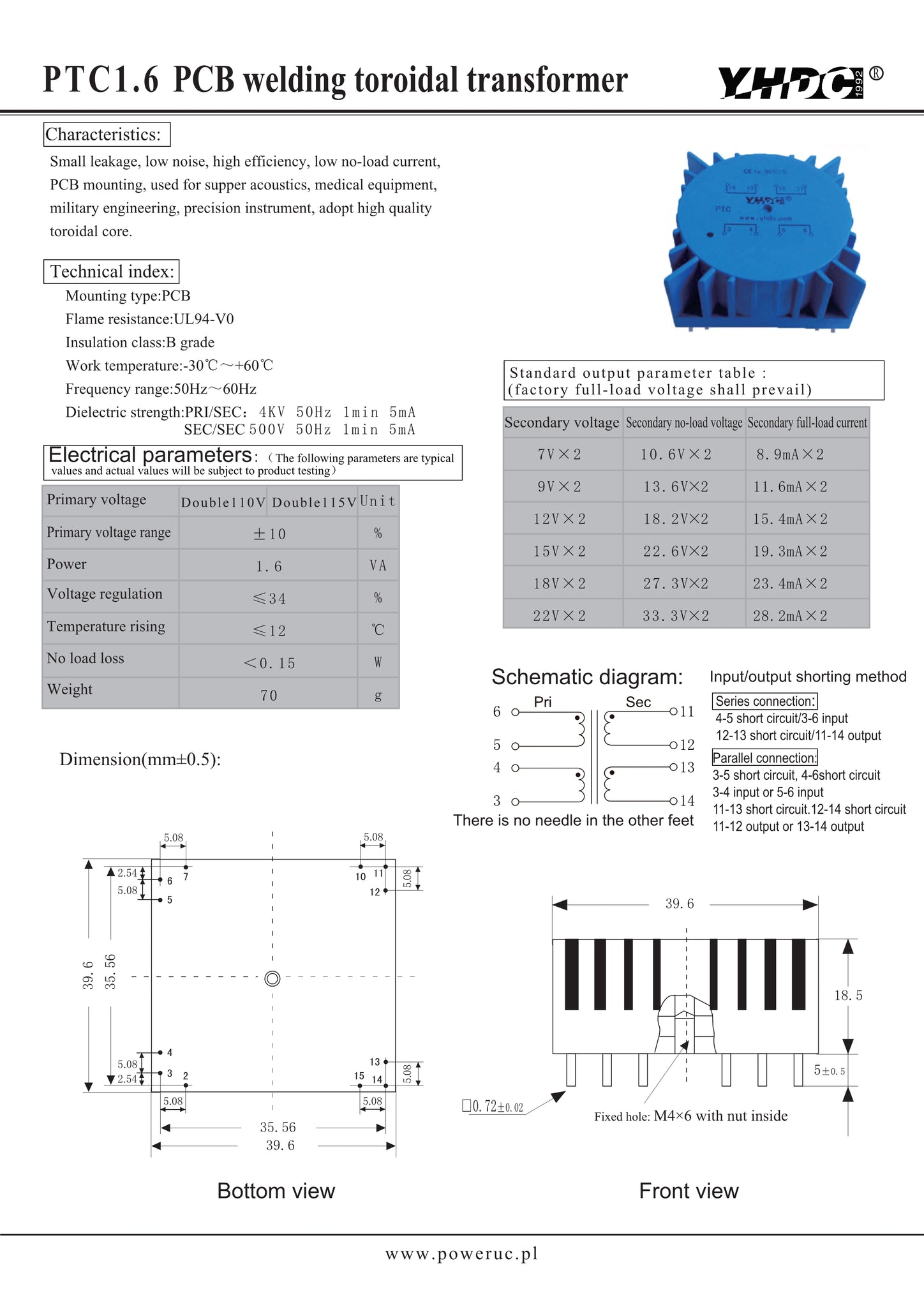 Small leakage, low noise, high efficiency, low no-load current, PCB mounting, used for supper acoustics, medical equipment, military engineering, precision instrument, adopt high quality toroidal core.