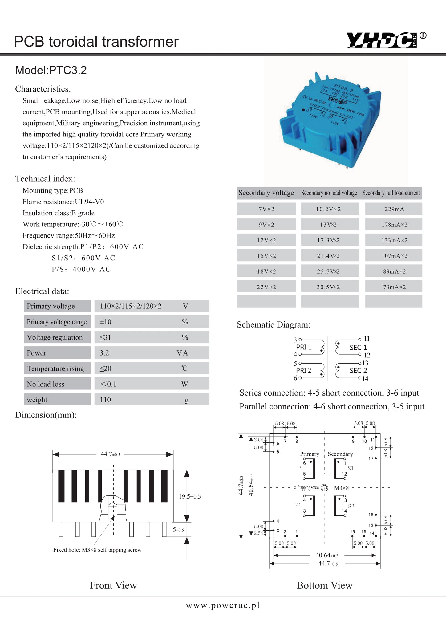 Small leakage, low noise, high efficiency, low no load current, PCB mounting, used for supper acoustics, medical equipment, military engineering, precision instrument, using the imported high quality toroidal core. Primary working voltage: 110x2/115x2/120x2 (can be customized according to customer's requirements).