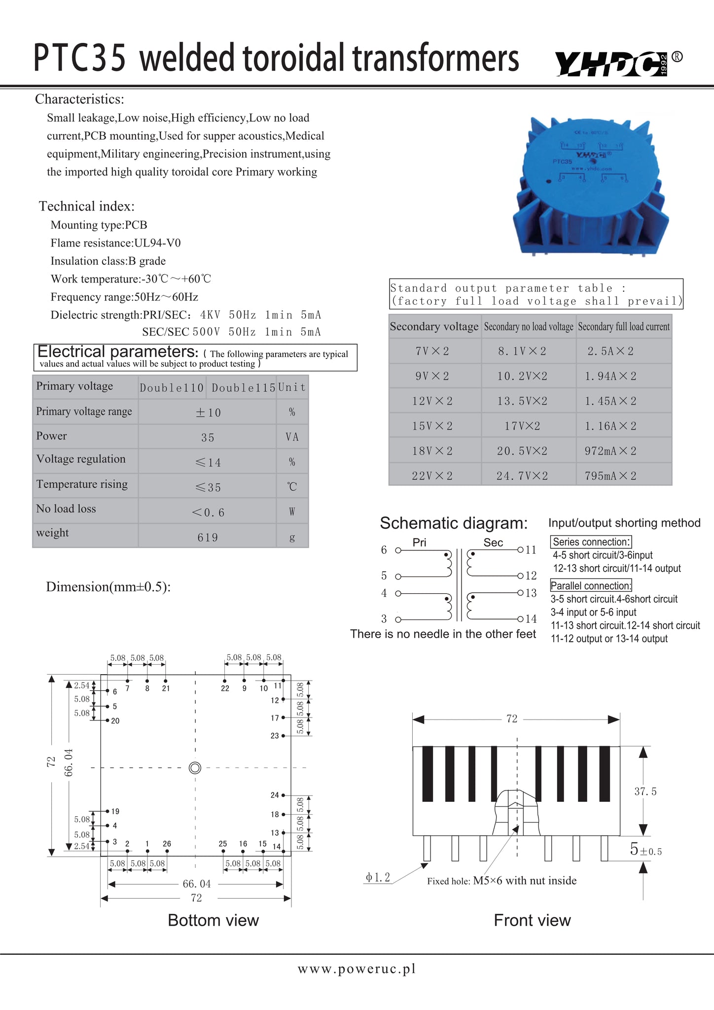 Small leakage, low noise, high efficiency, low no load current, PCB mounting, used for supper acoustics, medical equipment, military engineering, precision instrument, using the imported high quality toroidal core. Primary working voltage: 110x2/115x2/120x2 (can be customized according to customer's requirements).
