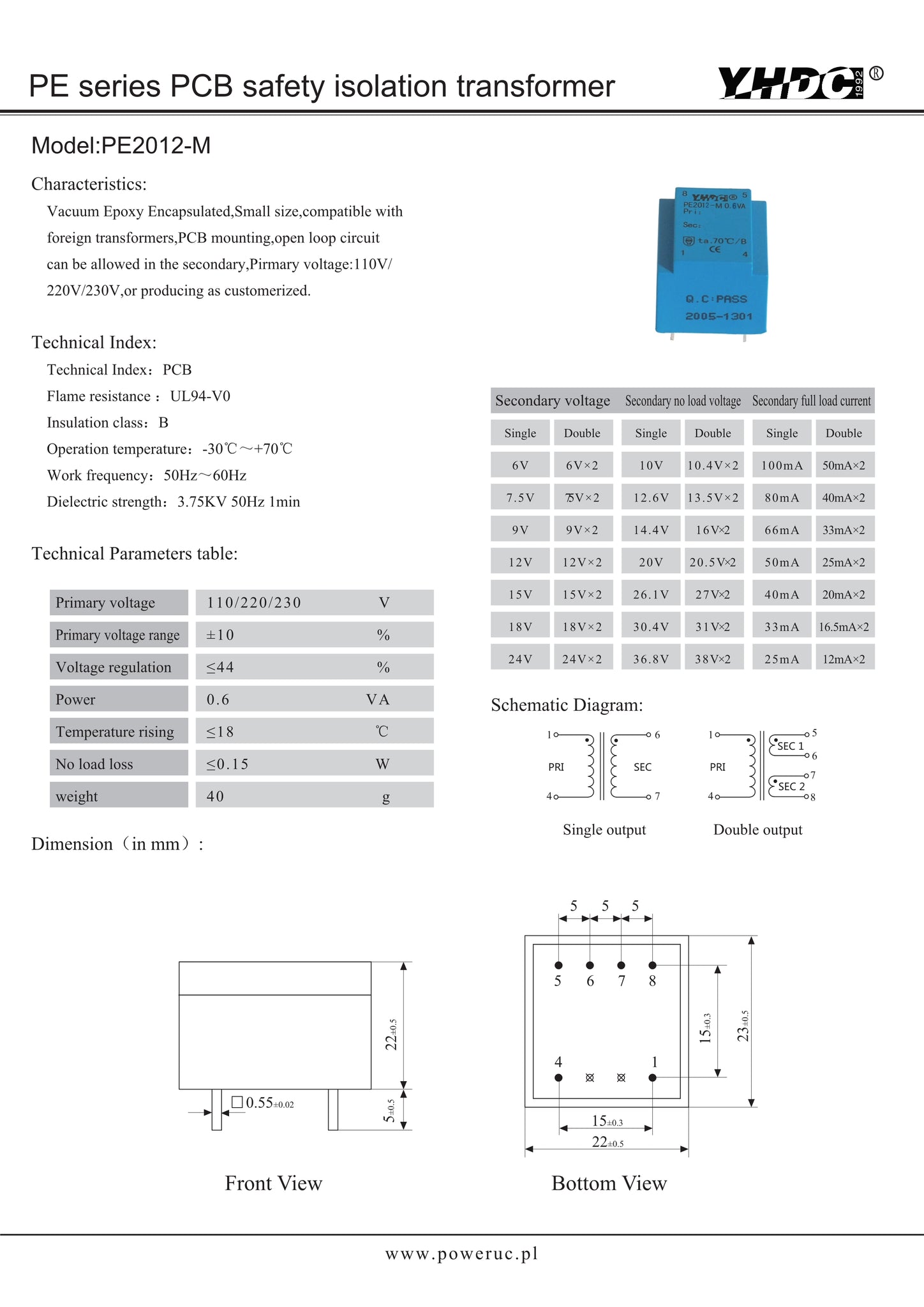 Vacuum epoxy encapsulated, small size, compatible with foreign transformers, PCB mounting, open loop circuit can be allowed in the secondary. Primary voltage: 110V/220V/230V or producing as customized.