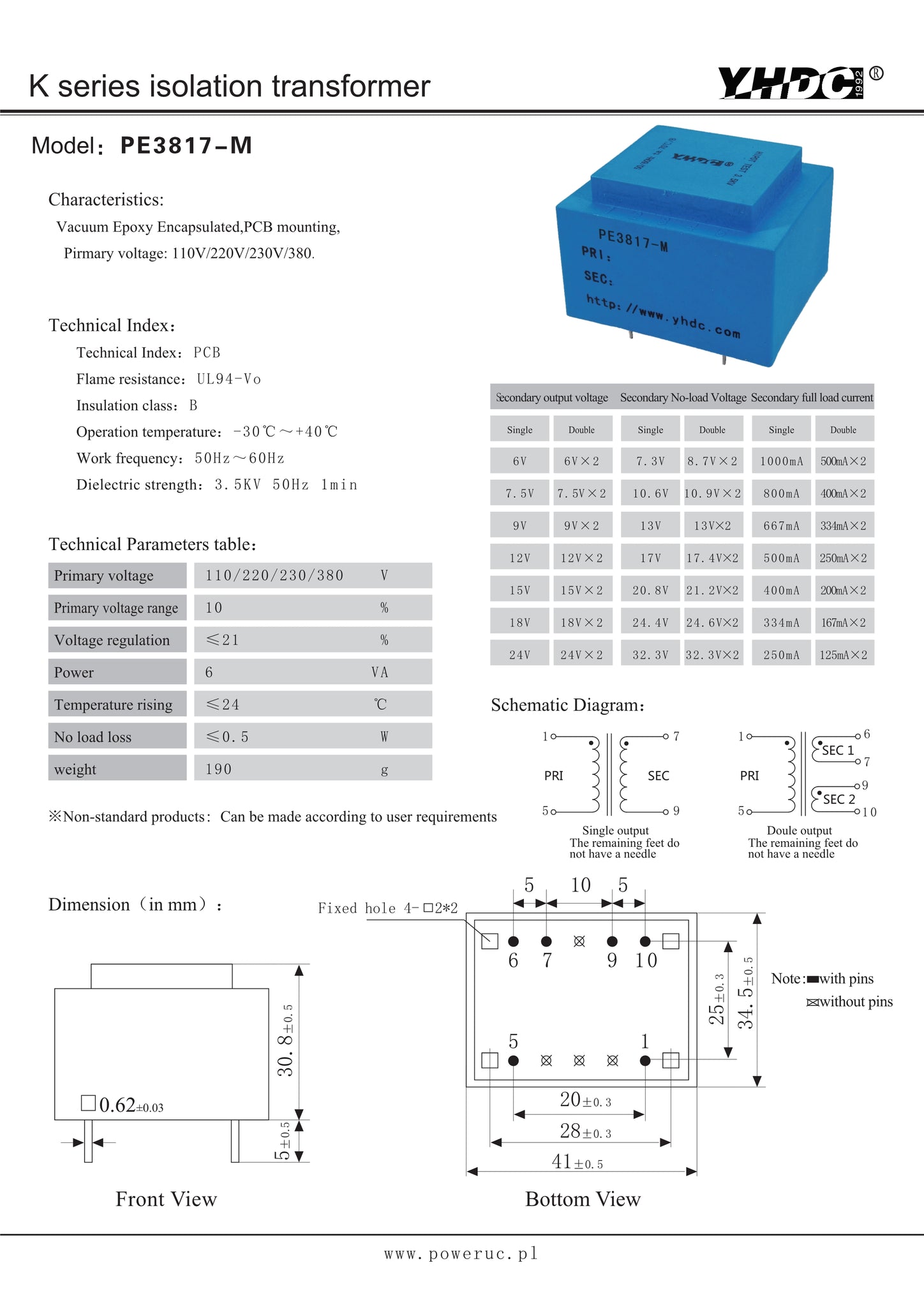 Vacuum epoxy encapsulated, PCB mounting. Primary voltage: 110V/220V/230V/380V