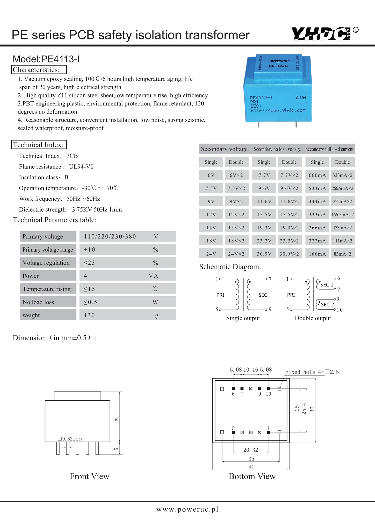 PE series PCB safety isolation transformer PE4113-I 110V/220V/230V/380 4VA