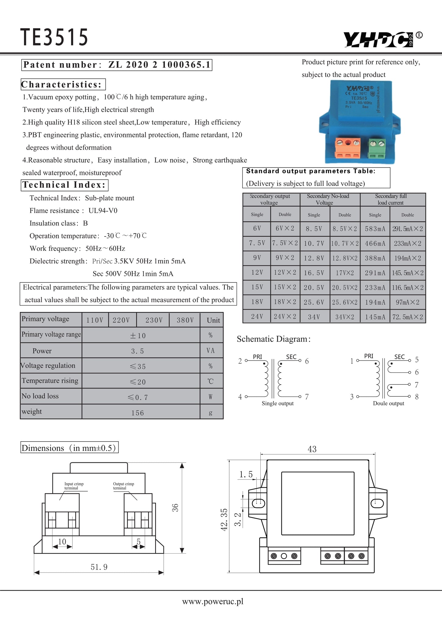 isolation transformer TE3515 110V/220V/230V/380V 3.5VA