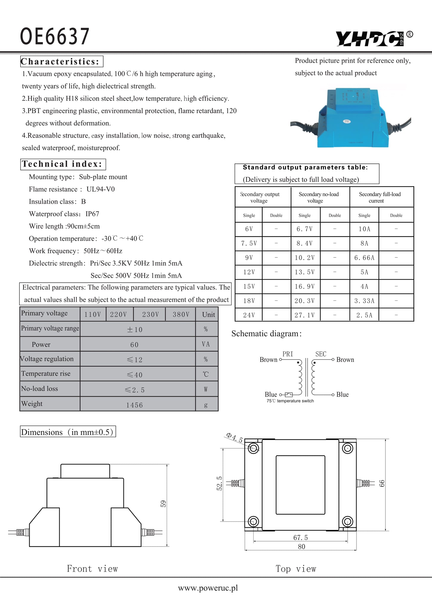 Waterproof transformer OE6637 Power 60VA Primary voltage 110V/220V/230V/380V Secondary output voltage 6V/7.5V/9V/12V/15V/18V/24V