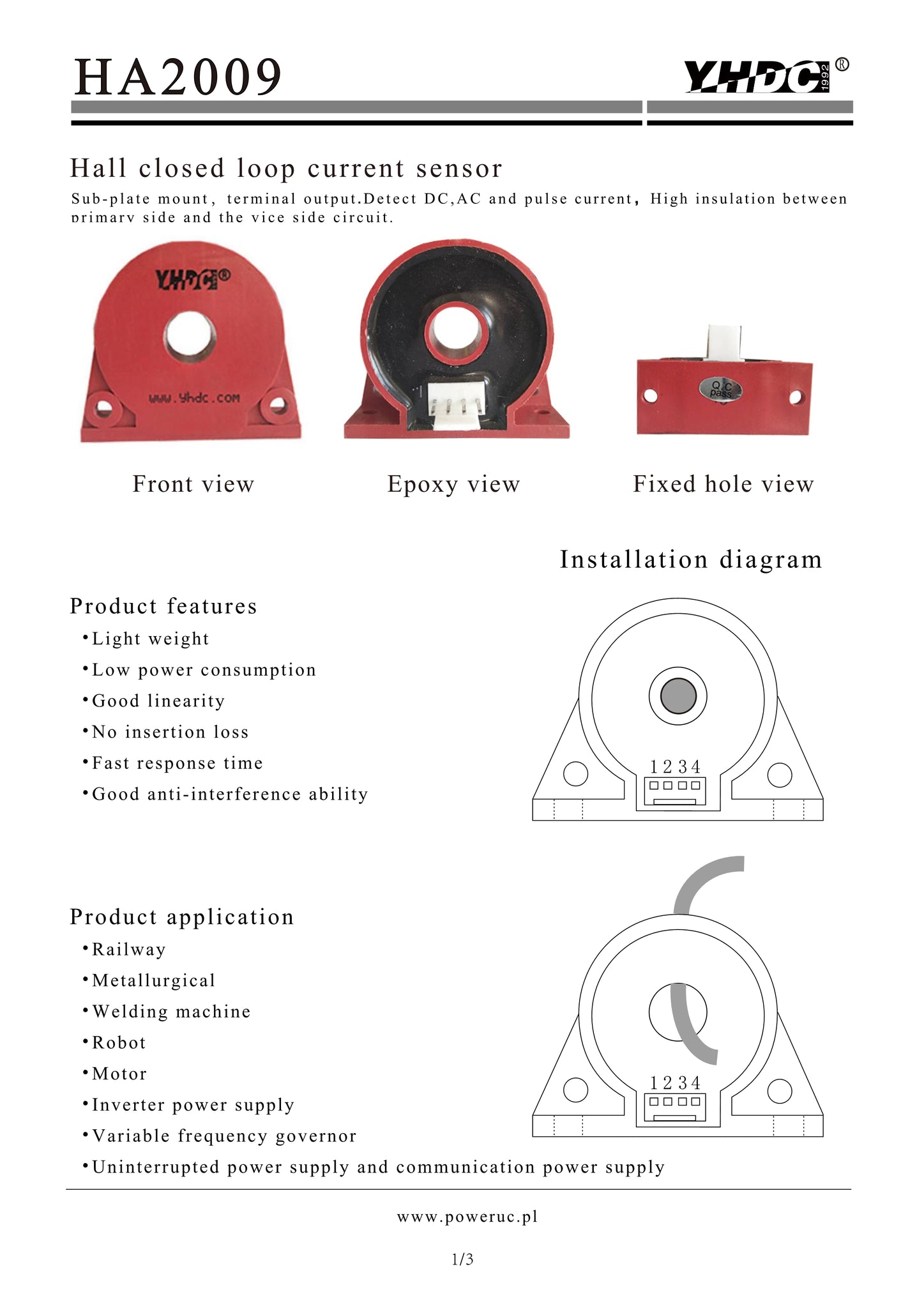 Closed loop current sensor HA2009 Rated input ±20A ±50A ±100A Rated output ±25mA ±33.3mA ±50mA