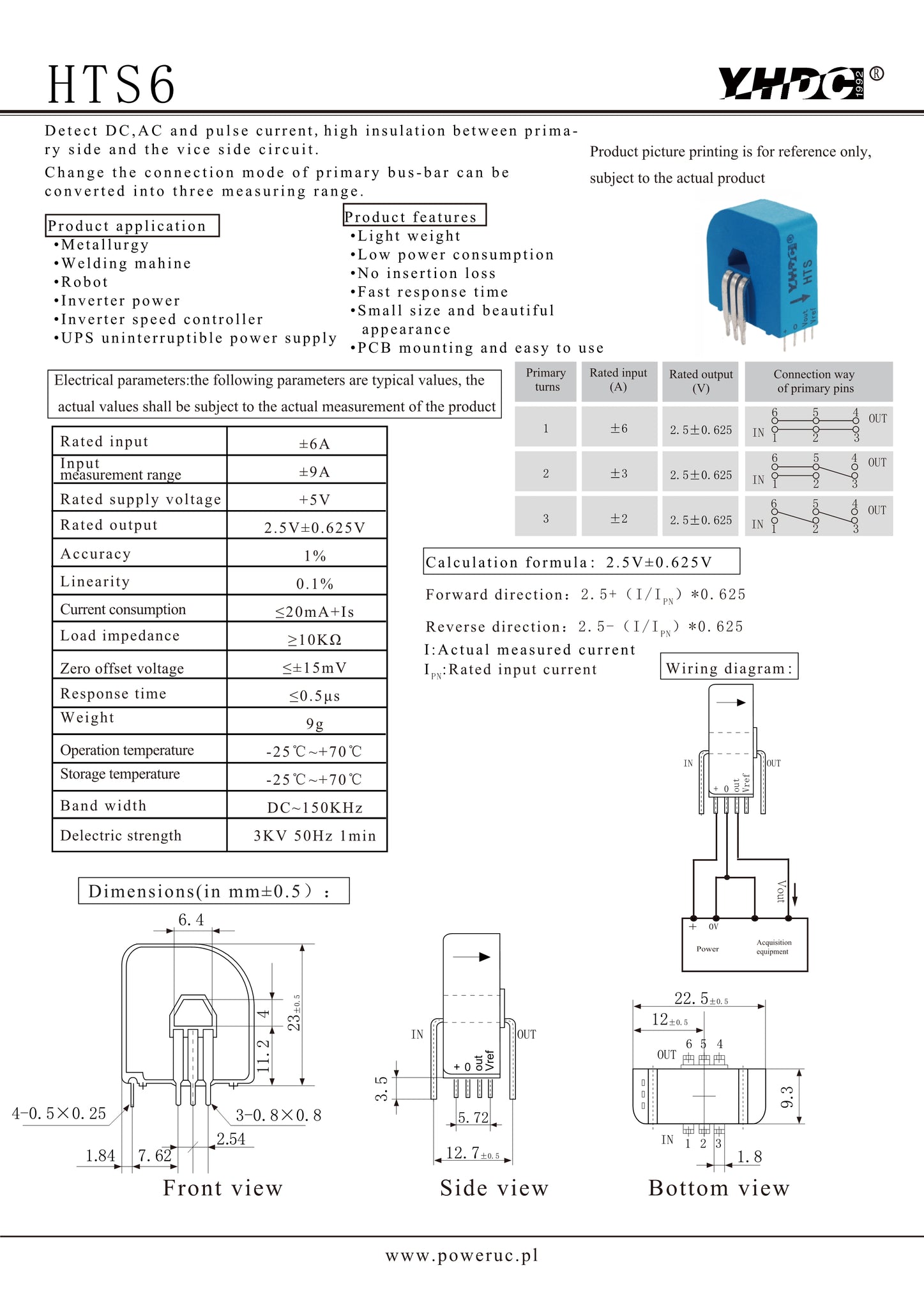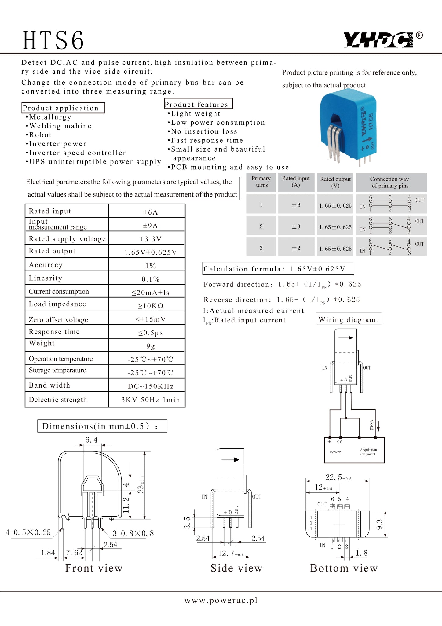 Closed loop multi-range current sensor HTS6 Rated input ±6A Rated output 2.5V±0.625V/1.65V±0.625V Rated supply voltage +5V/+3.3V (with Vref and without Vref)