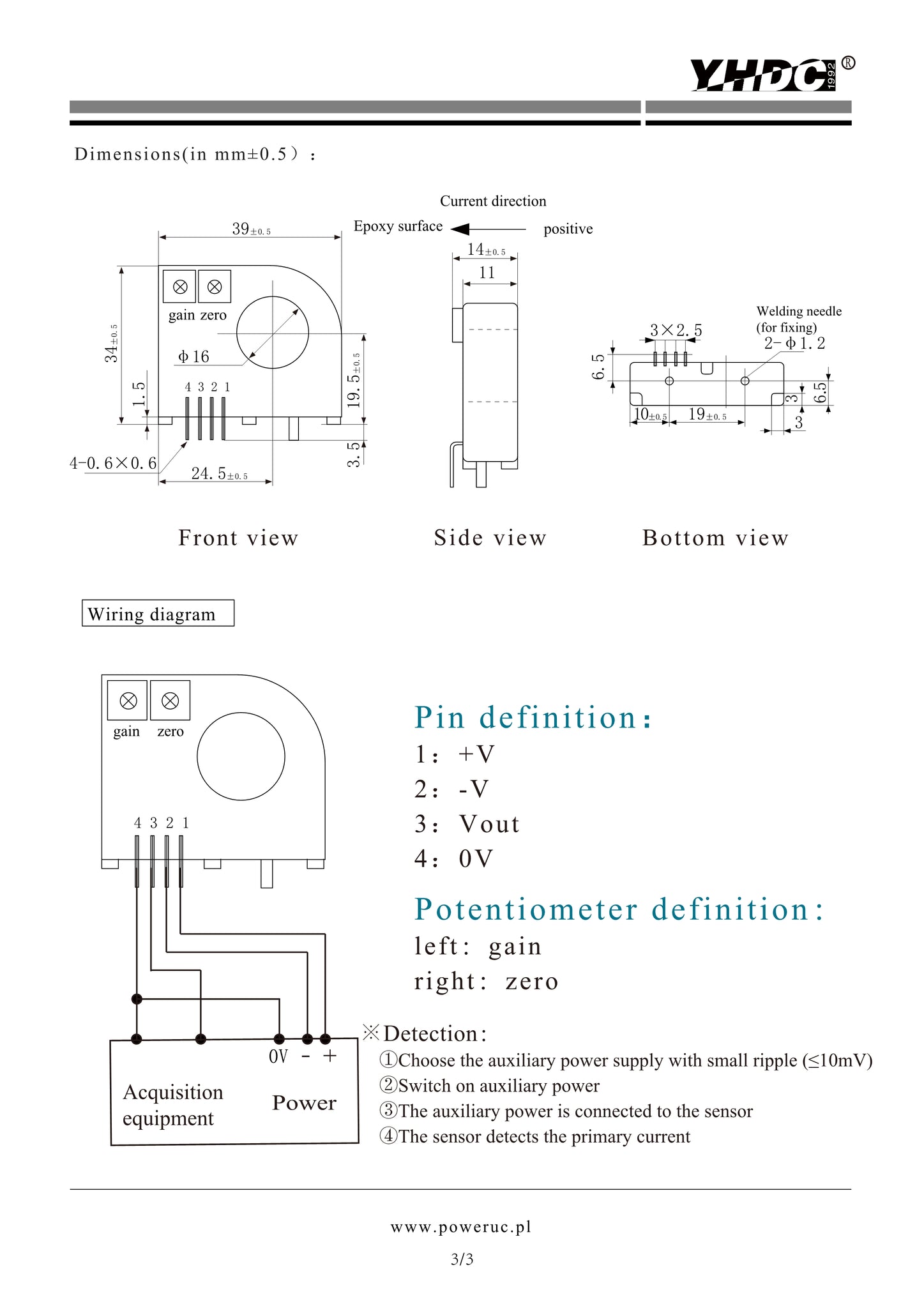 Open loop, wear core aperture Ø16, PCB welding type. Detect DC, AC and pulse current.