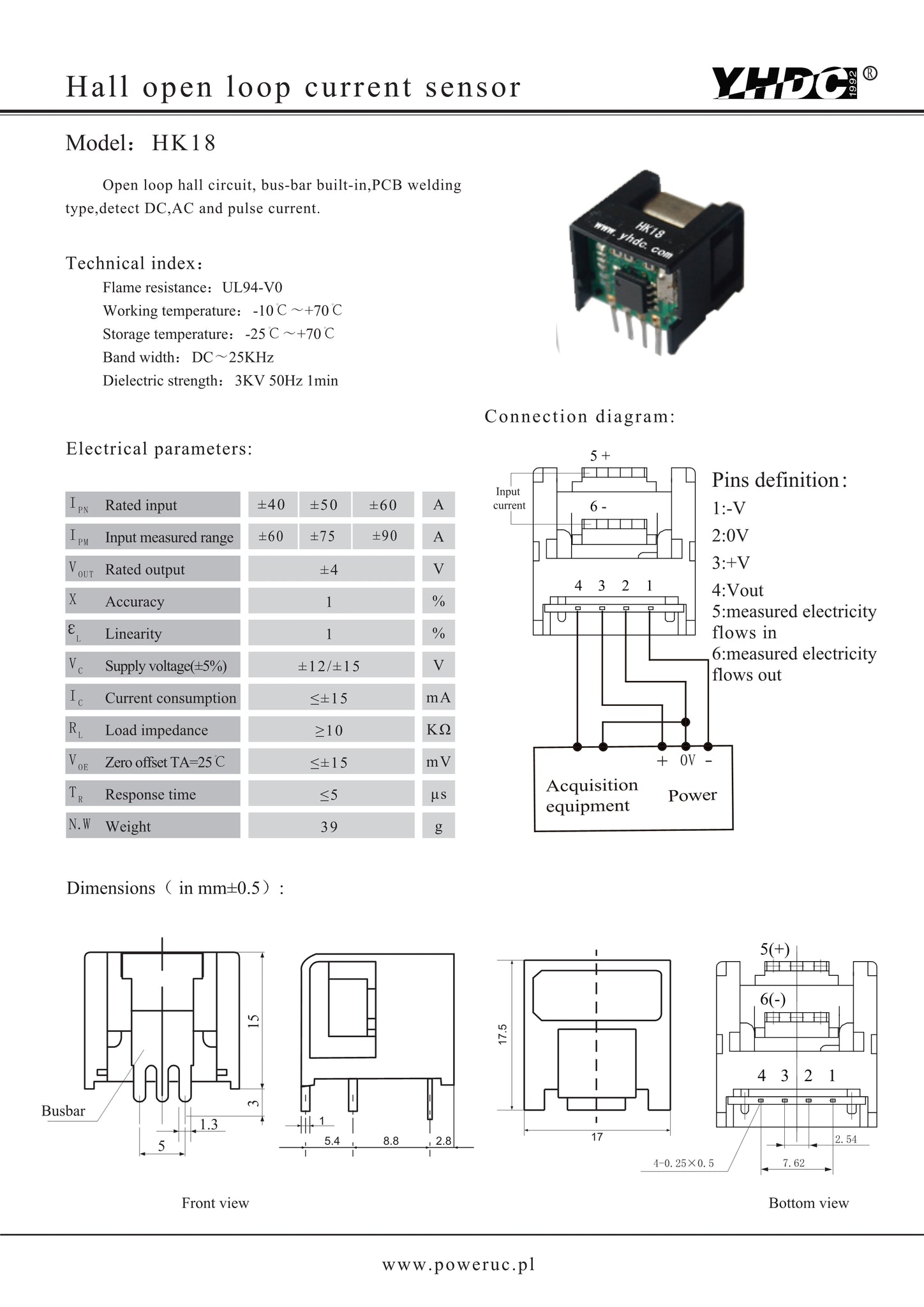Open loop current sensor HK18 Rated input ±40A ±50A ±60A Rated output ±4V