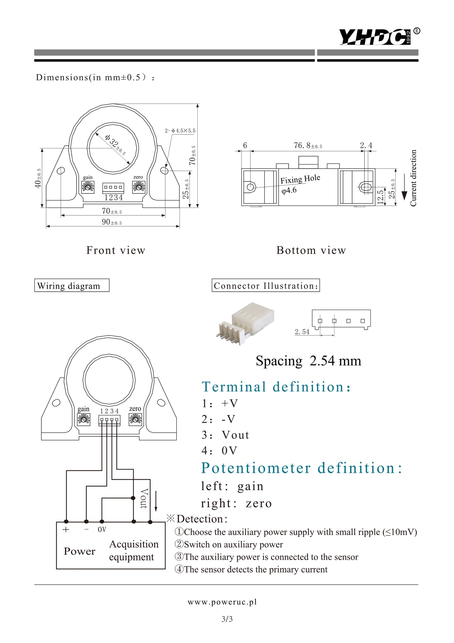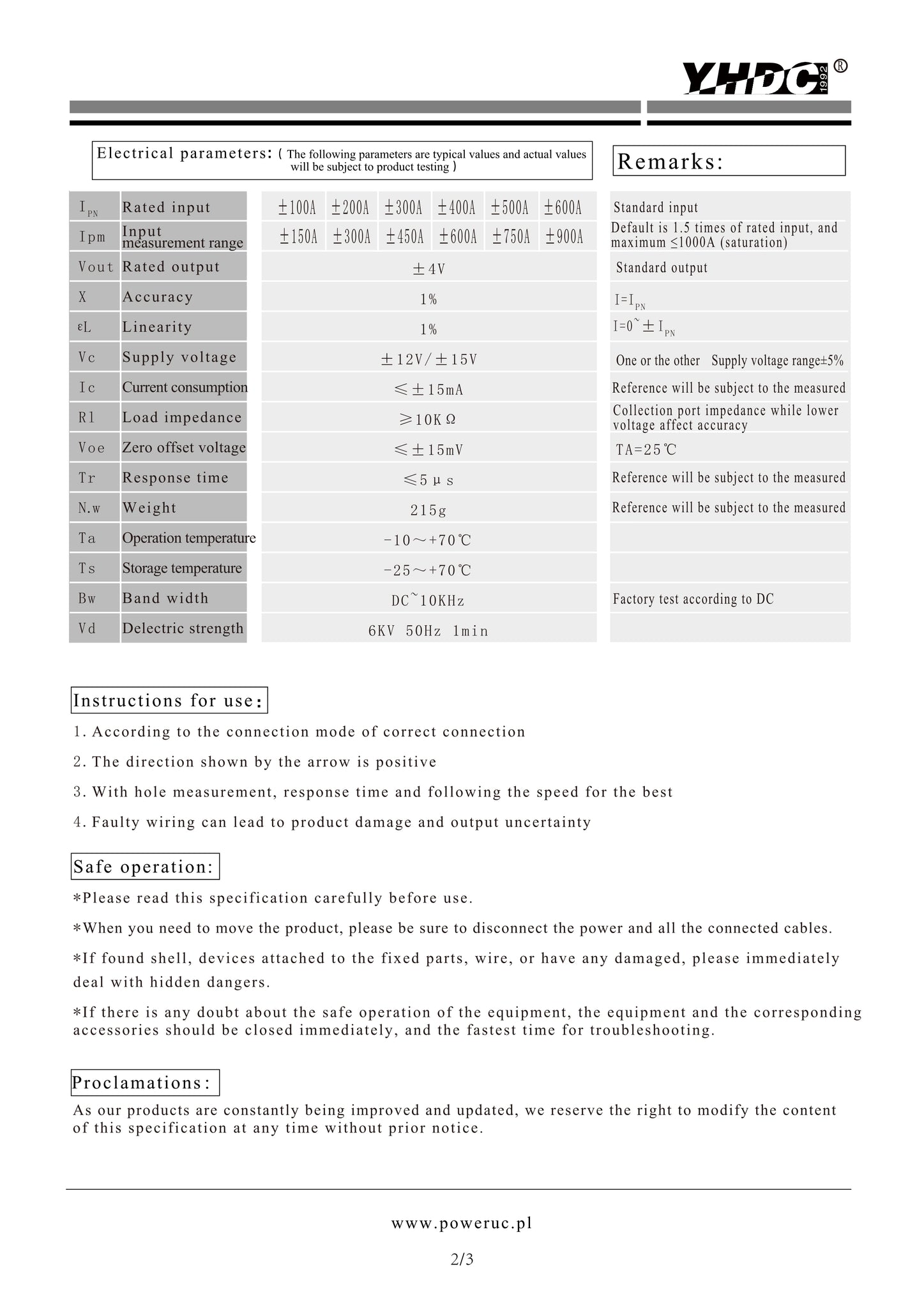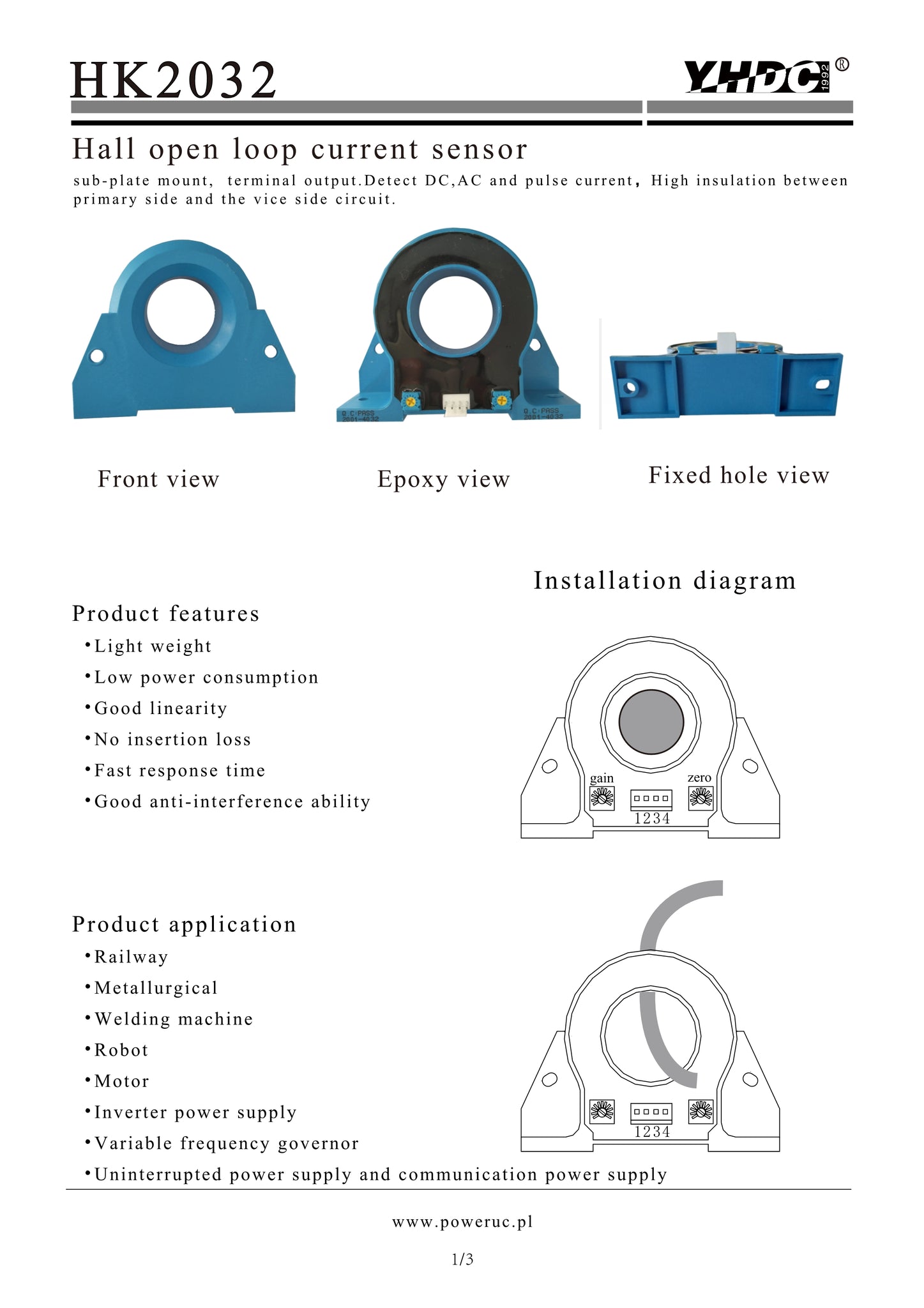 Hall open loop current sensor HK2032 Rated input ±100A ±200A ±300A ±400A ±500A ±600A Rated output ±4V - PowerUC
