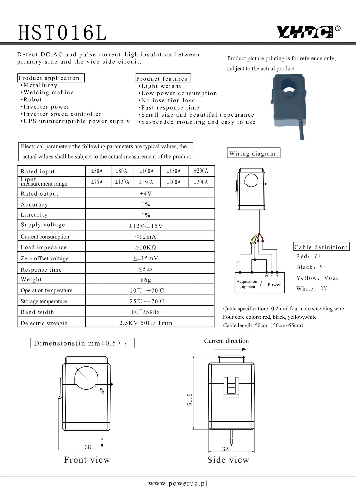 Split core current sensor HST016L Rated input ±50A ±80A ±100A ±150A ±200A Rated output ±4V