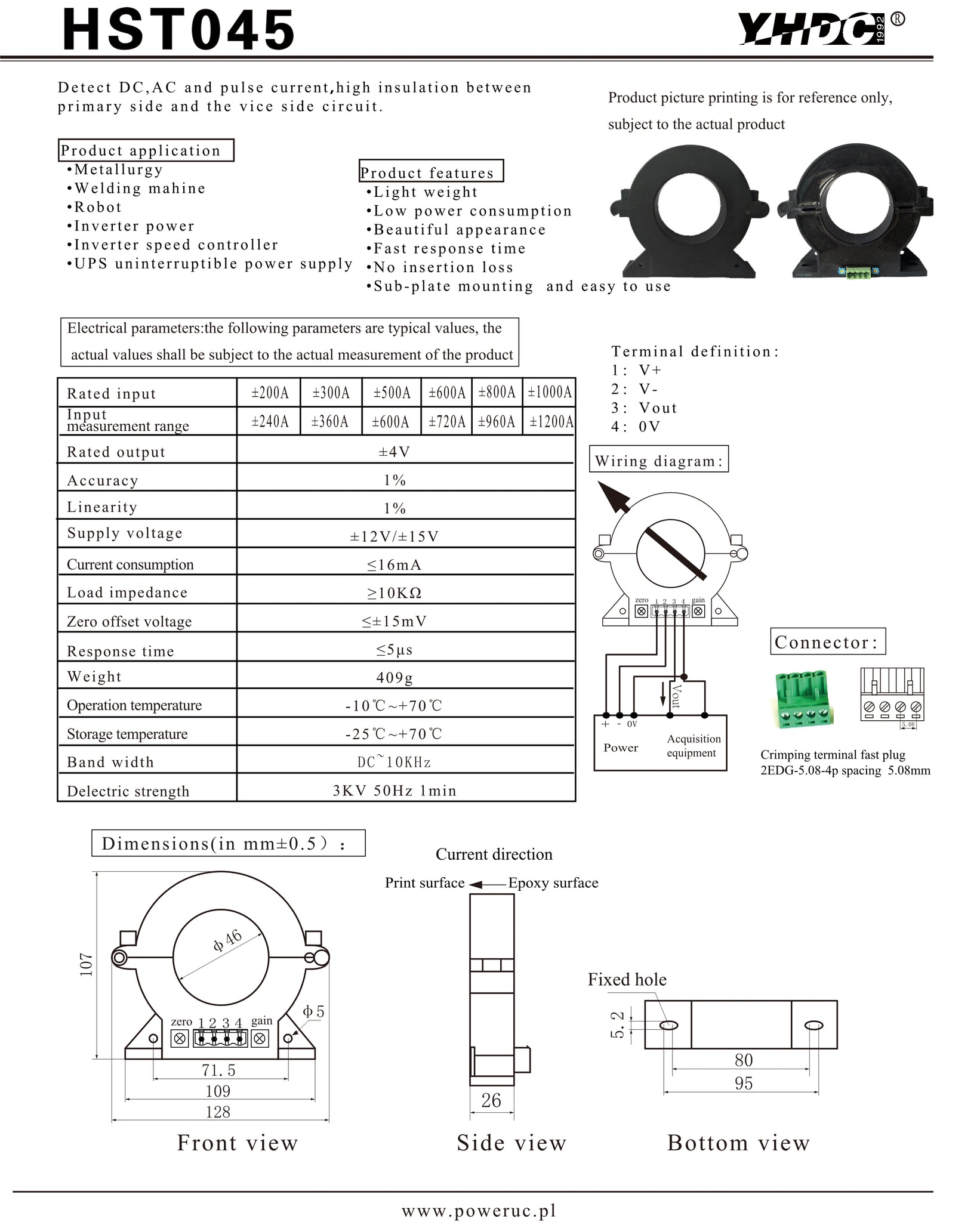 Split core current sensor HST045 Rated input ±200A ±300A ±500A ±600A ±800A ±1000A Rated output ±4V
