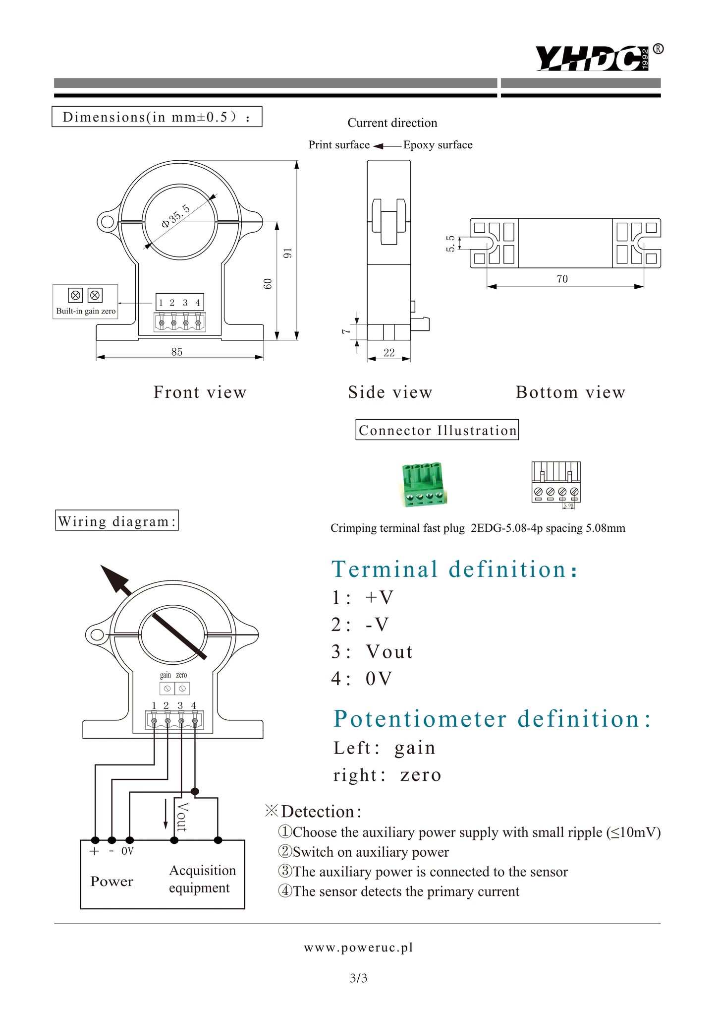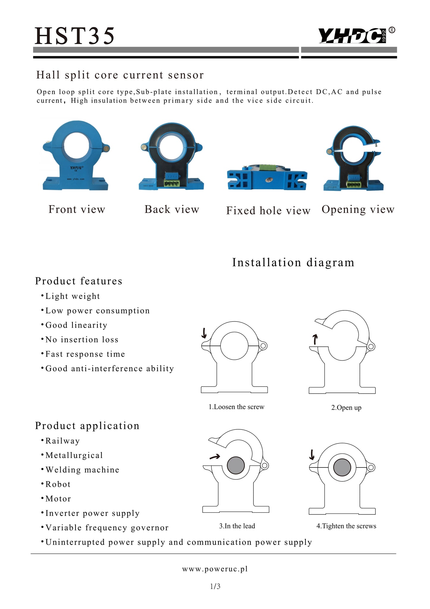 Split core current sensor HSTS016L Rated input ±10A ±20A ±30A ±50A ±100A ±150A ±200A Rated output 1.65V±0.625V/+3.3V And 2.5V±0.625V/+5V