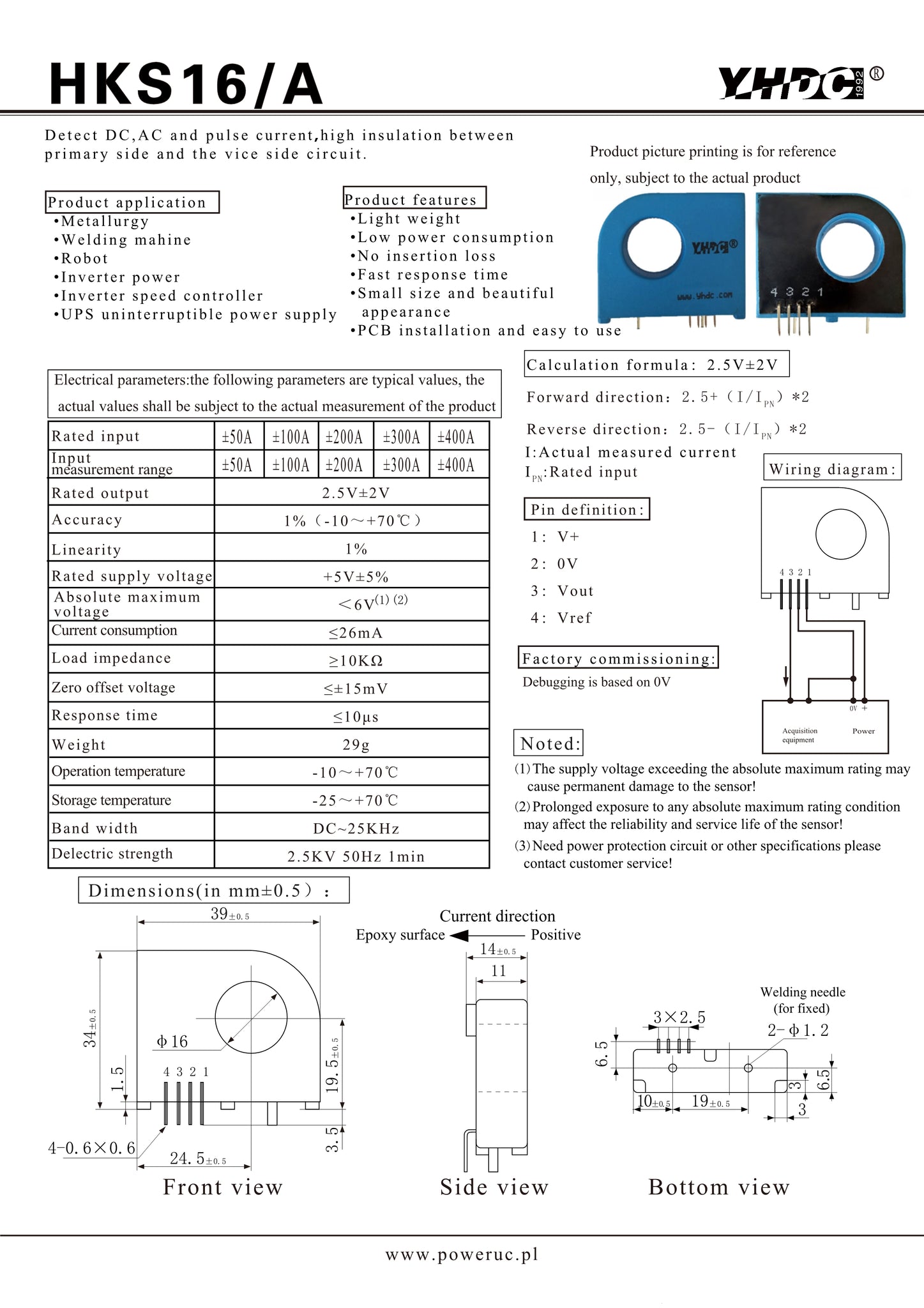 Hall sensor HKS16/A Rated input ±50A ±100A ±200A ±300A ±400A Rated output 2.5V±2V
