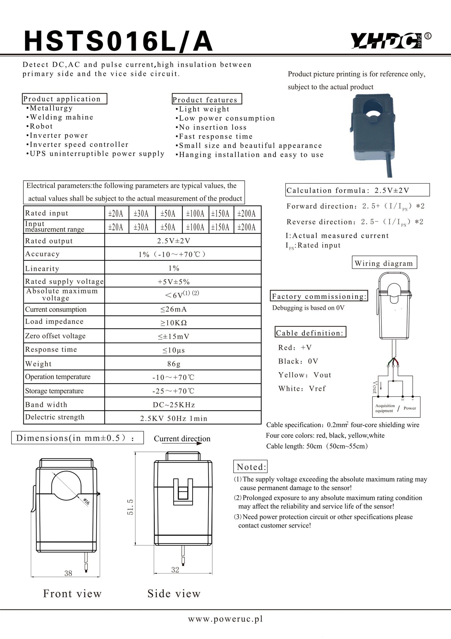 Split core current sensor HSTS016L Rated input ±10A ±20A ±30A ±50A ±100A ±150A ±200A Rated output 1.65V±0.625V/+3.3V And 2.5V±0.625V/+5V