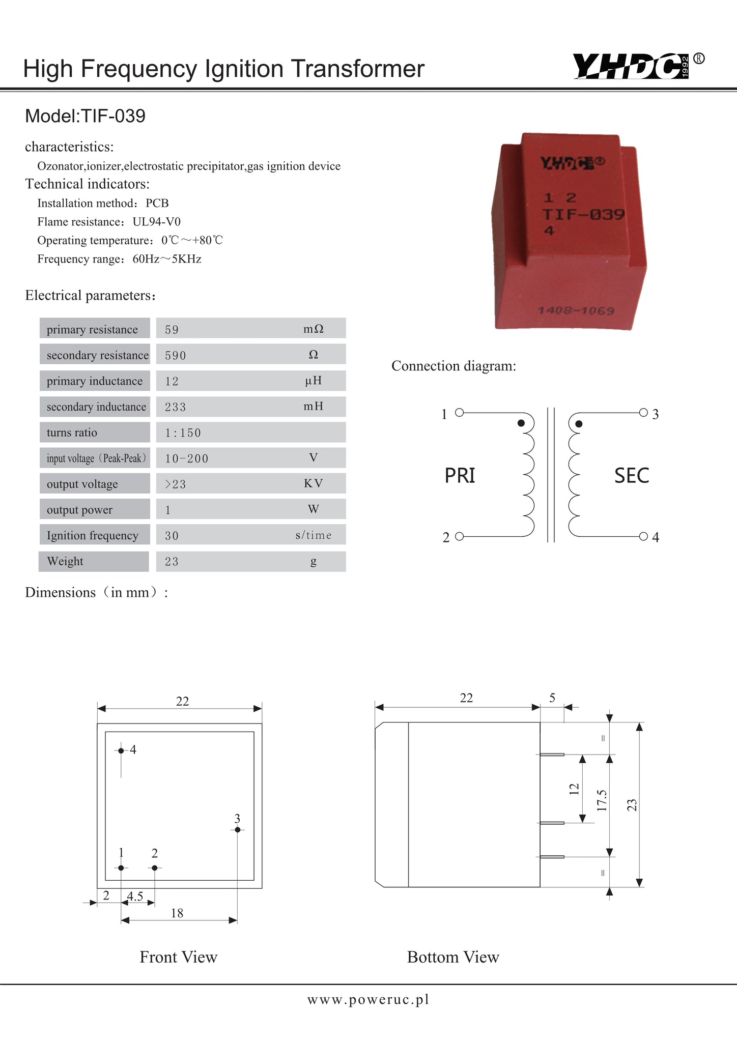 High Frequency Ignition Transformer TIF-039 primary resistance 59mΩ
