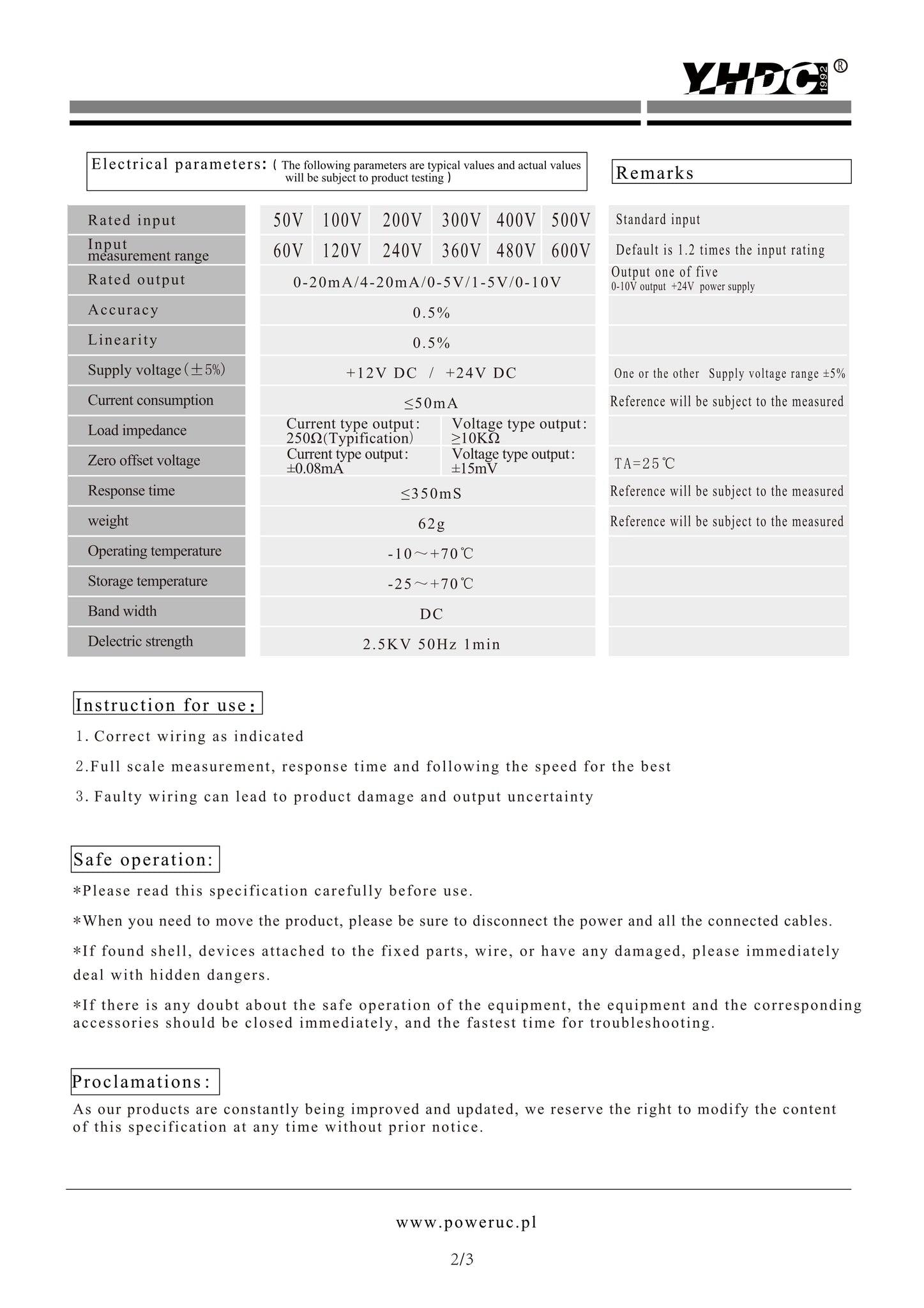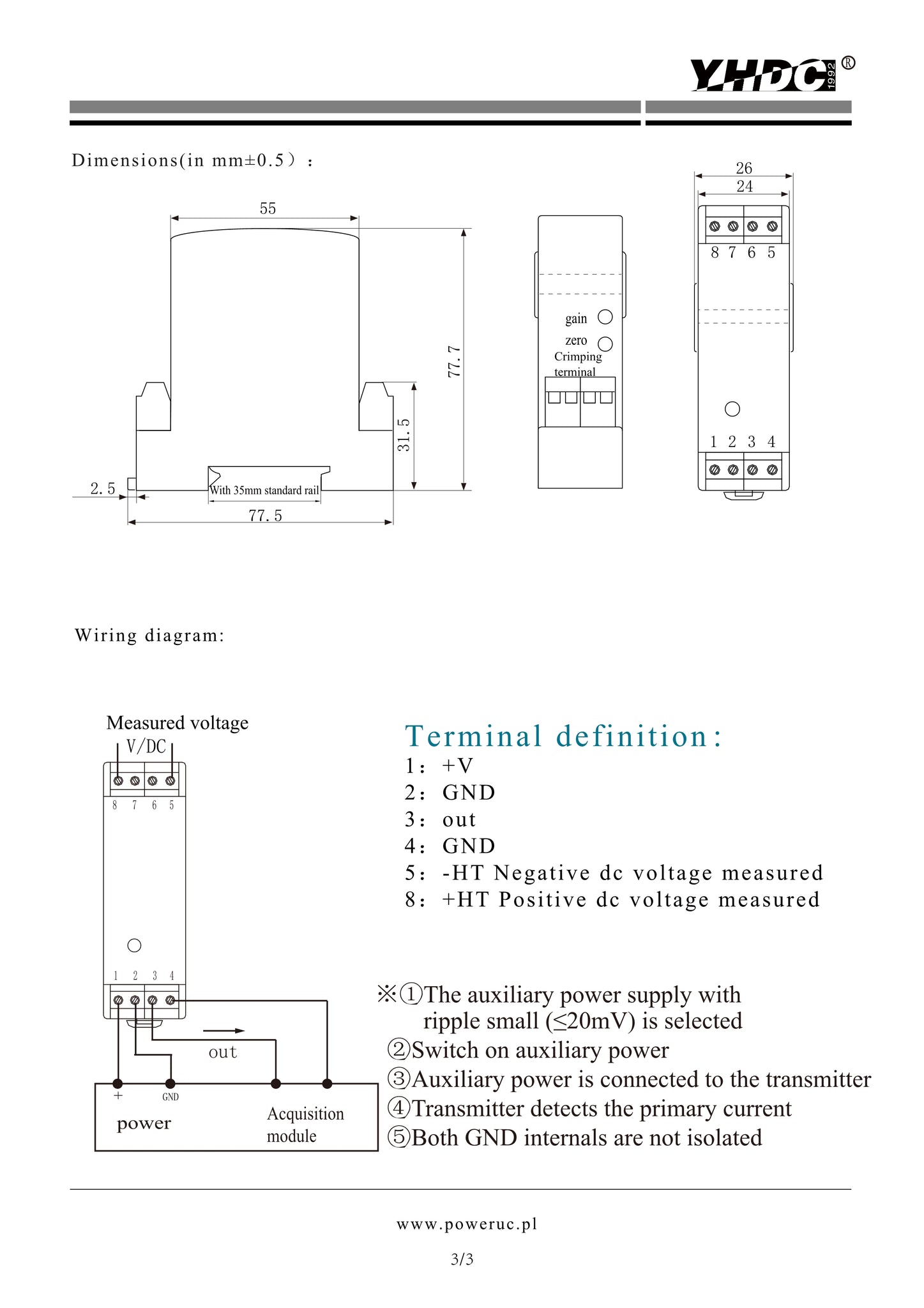 Circular aperture,terminal output,din-rail mounting type;The faulty wiring can lead to product damage,When measuring DC voltage, +HT -HT is not allowed to reverse,The output is linear with primary test current,and the output signal can be directly enter automatic control equipment or PLC port.