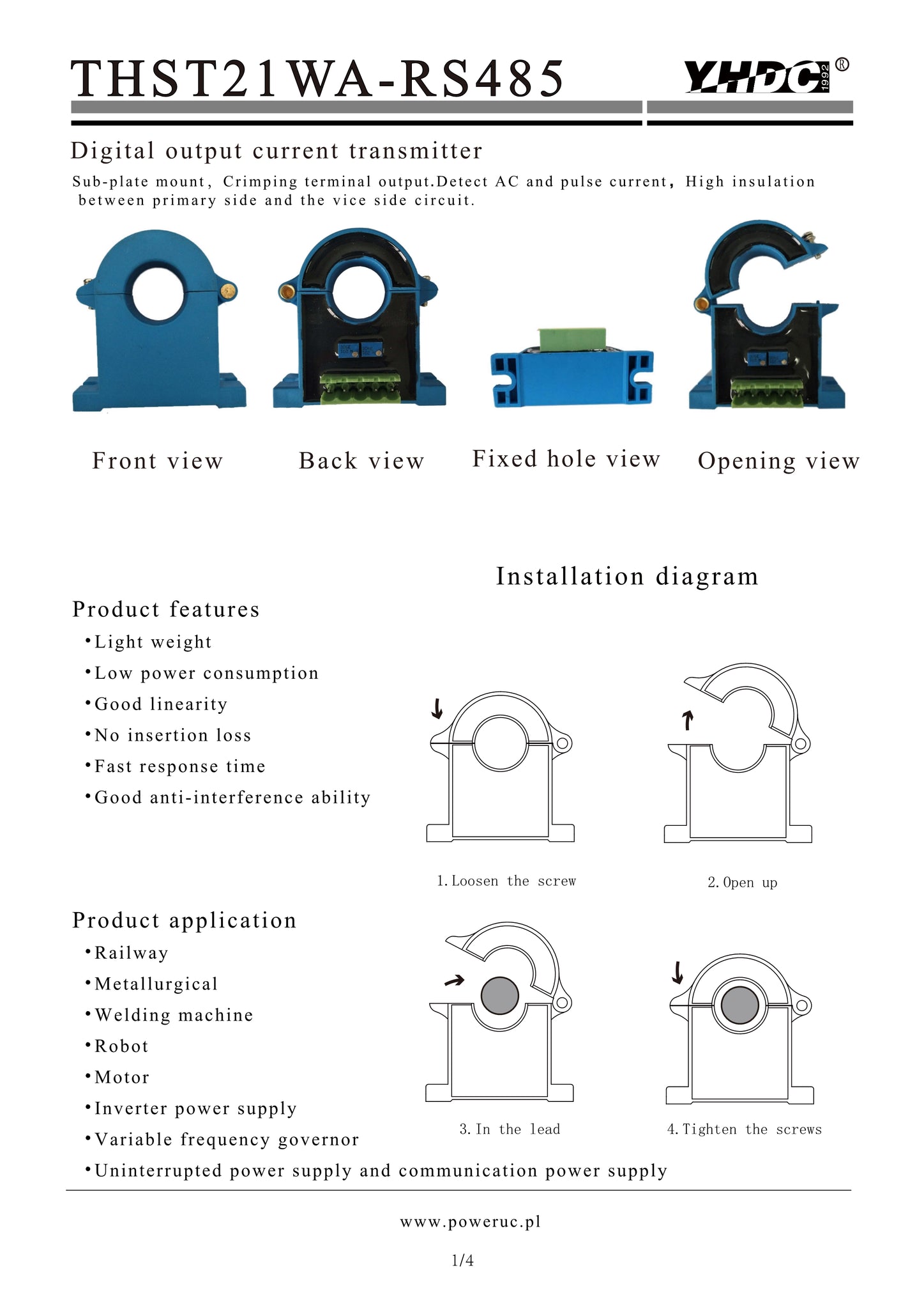 Split core AC Digital output current transducer table THST21WA-RS485 rated input 50A 100A 200A 300A 400A 500A power supply ±12V ±15V