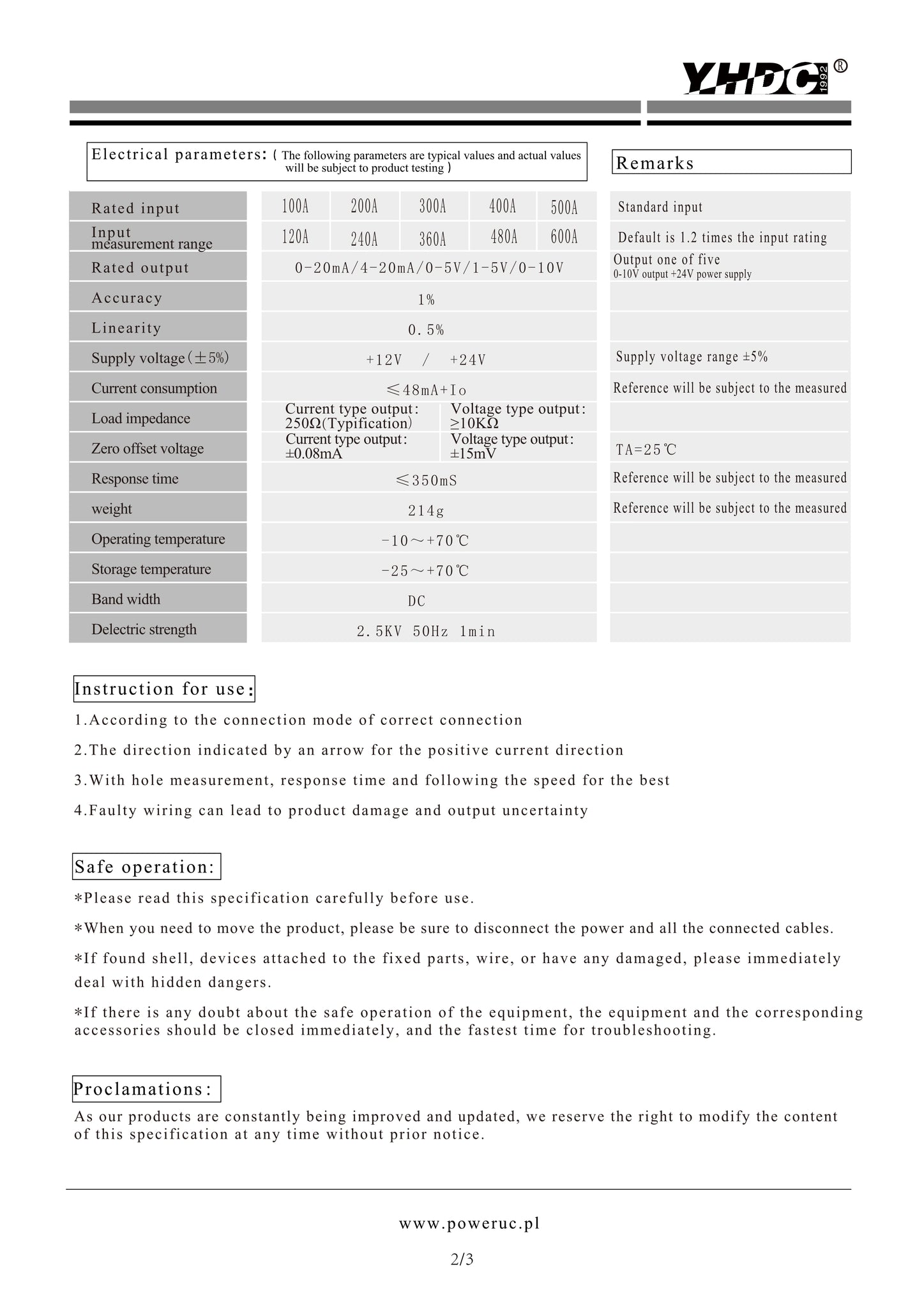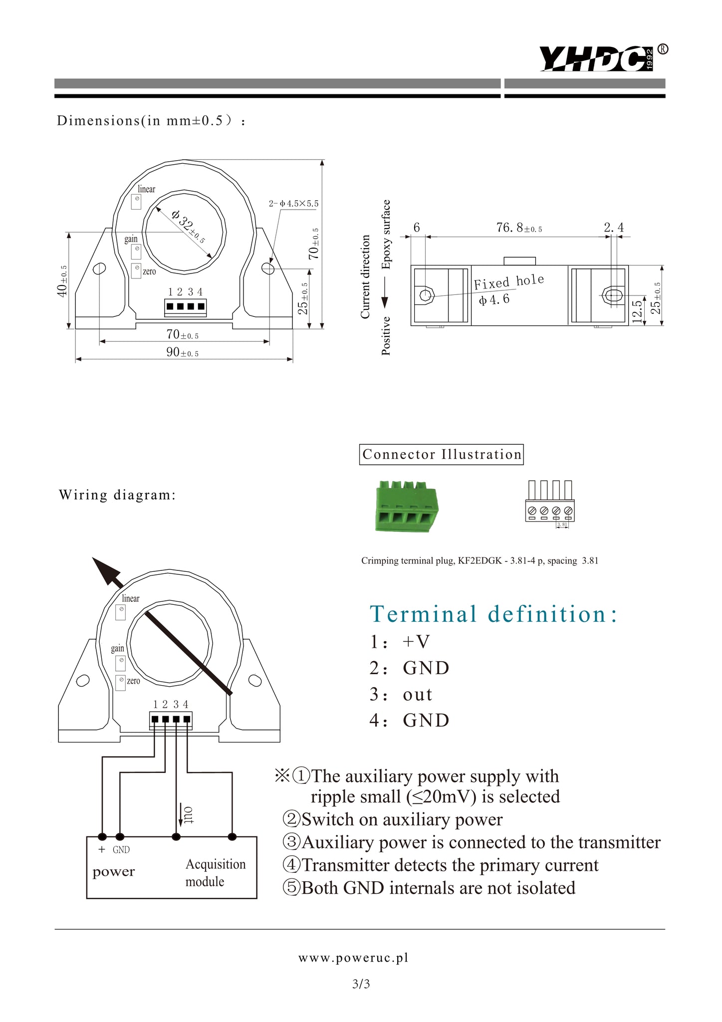 Circle plug terminal output,sub-plate mounting type;The faulty wiring can lead to product damage,Please according to direction of arrow to thread when testing DC current,reverse threading will lead to inaccurate output,The output is linear with primary test current,and the output signal can be directly enter automatic control equipment or PLC port.