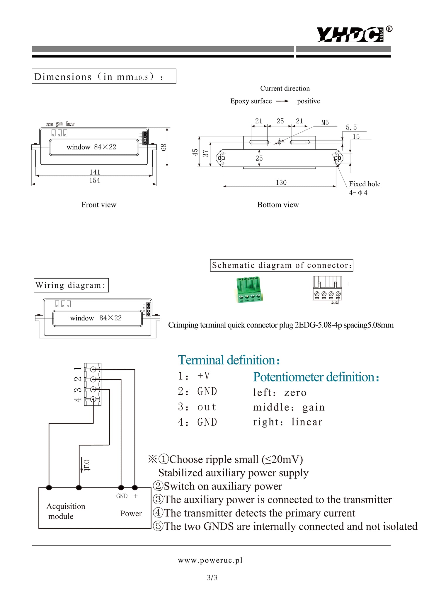 Square hole plug terminal output,sub-plate mountsub-plate mounting type;The faulty wiring can lead to product damage,Please according to direction of arrow to thread when testing DC current,reverse threading will lead to inaccurate output, The output is linear with primary test current,and the output signal can be directly enter automatic control equipment or PLC port.