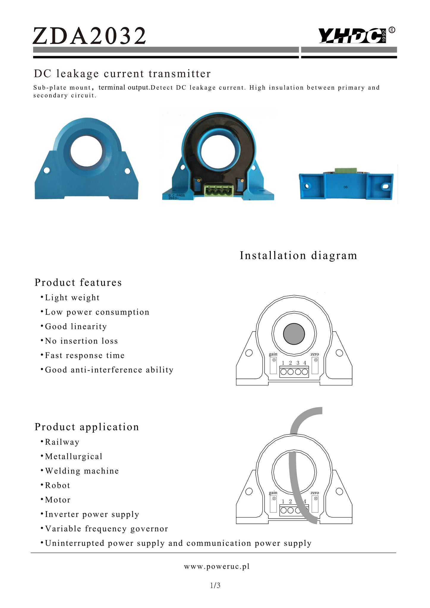 DC leakage current transducer ZDA2032 Rated input 10mA 20mA 50mA 100mA 500mA 1A 1.5A 2A Rated output 0-20mA;4-20mA;0-5V;1-5V;0-10V