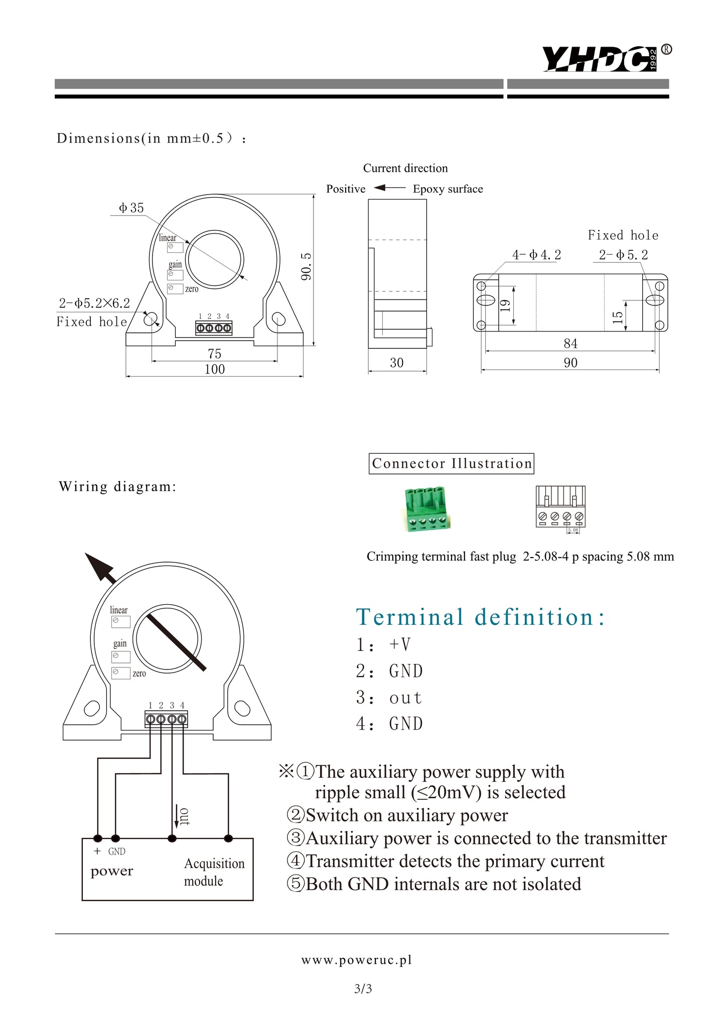 Circle plug terminal output,sub-plate mounting type;The faulty wiring can lead to product damage,Please according to direction of arrow to thread when testing DC current,reverse threading will lead to inaccurate output,The output is linear with primary test current,and the output signal can be directly enter automatic control equipment or PLC port.