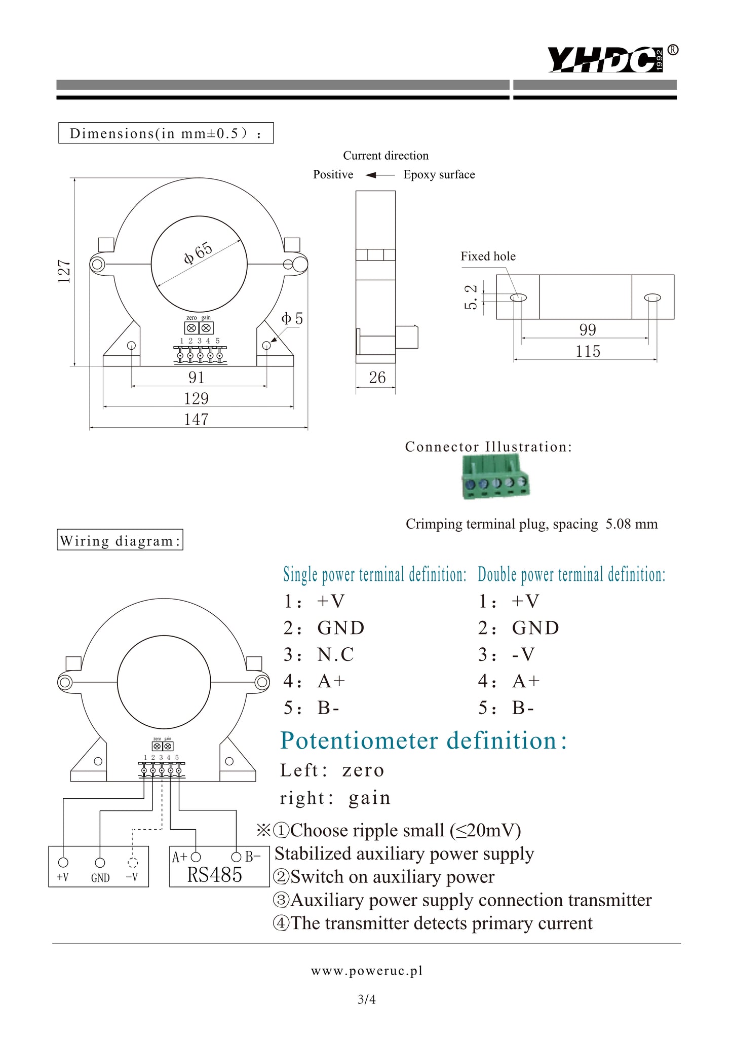 Circle plug terminal output, sub-plate mounting type; The faulty wiring can lead to product damage:The output is linear with primary test current,The output signal can be connected to a digital acquisition device that supports the RS485 communication interface to realize data acquisition and processing.