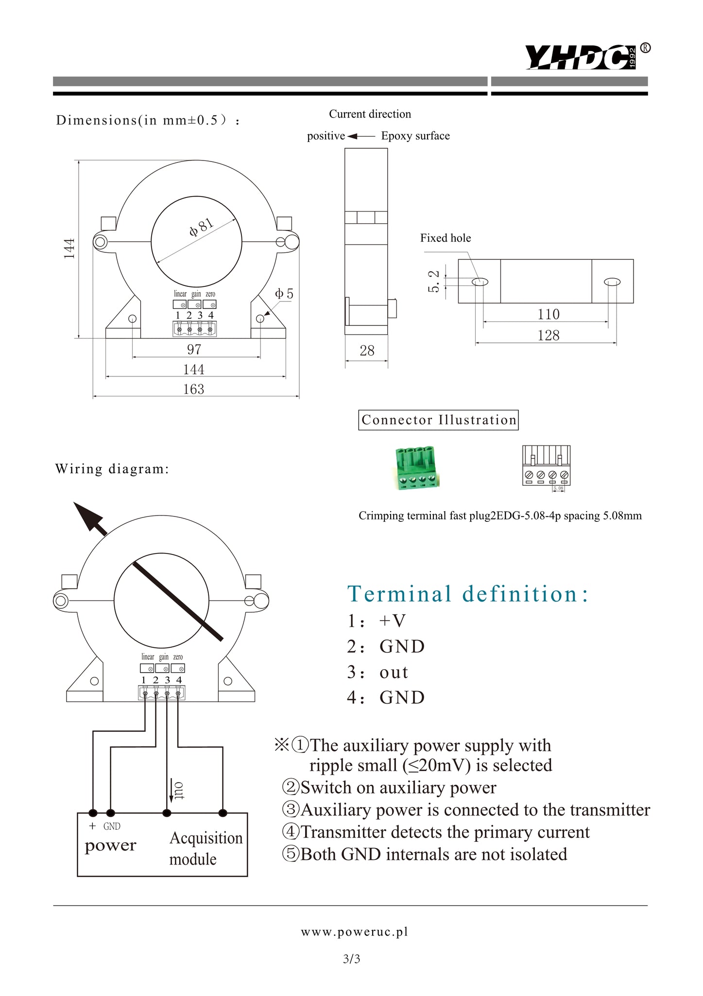 Circle plug terminal outputsub-plate mounting type;The faulty wiring can lead to product damage,Please according to direction of arrow to thread when testing DC current,reverse