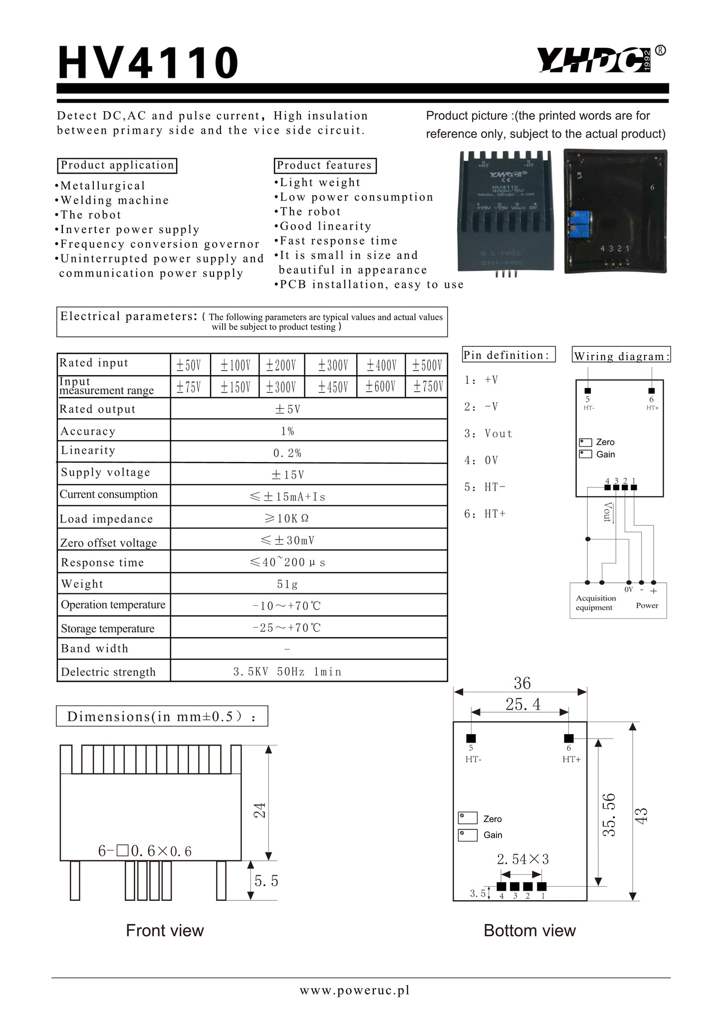 Voltage sensor HV4110 Rated input ±50V ±100V ±200V ±300V ±400V ±500V Rated output ±5V