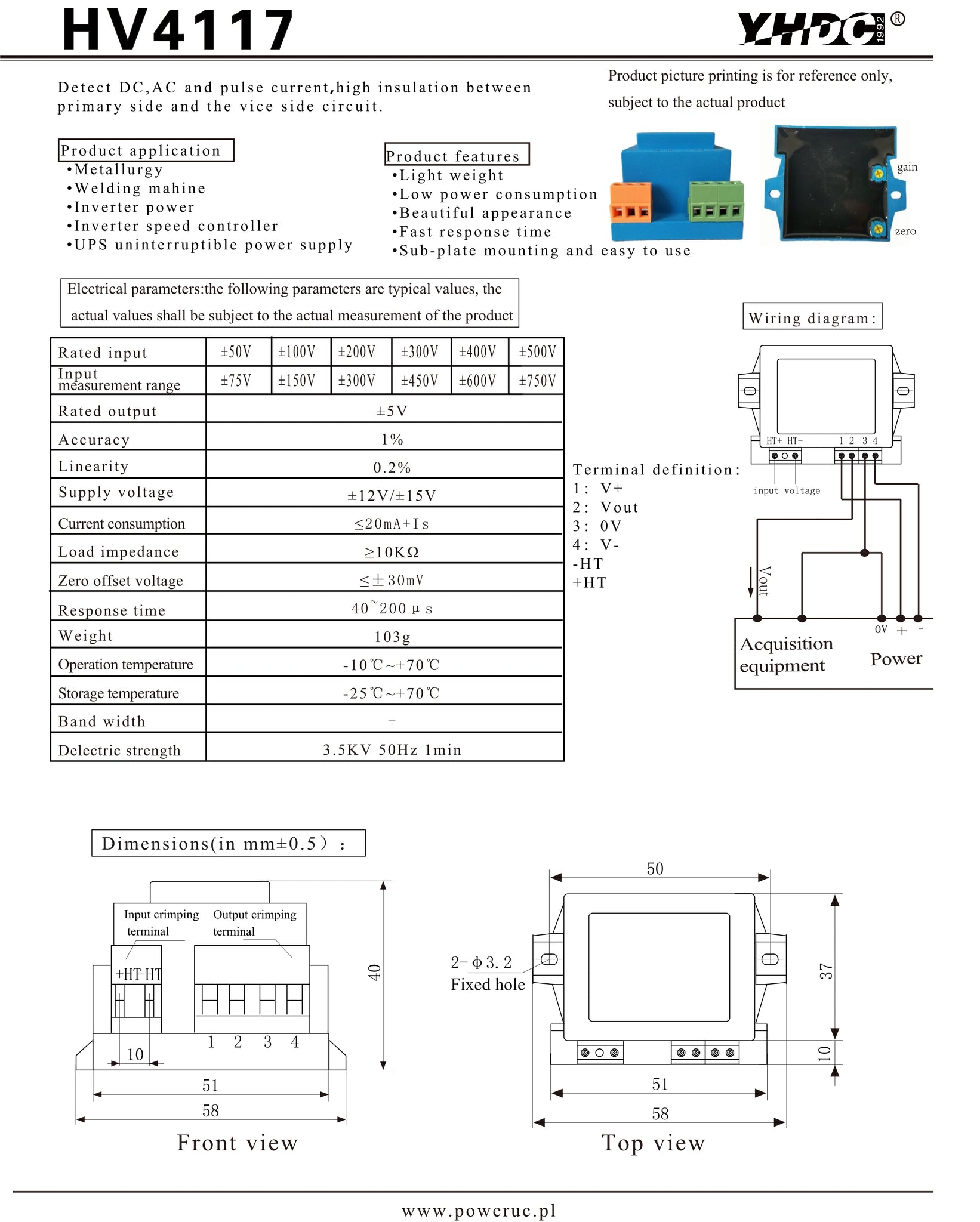 Voltage sensor HV4117 Rated input ±50V ±100V ±200V ±300V ±400V ±500V Rated output ±5V