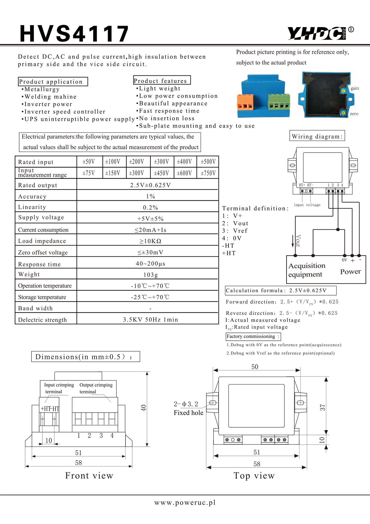 Voltage sensor HVS4117 Rated input ±50V ±100V ±200V ±300V ±400V ±500V Rated output 2.5V±0.625V