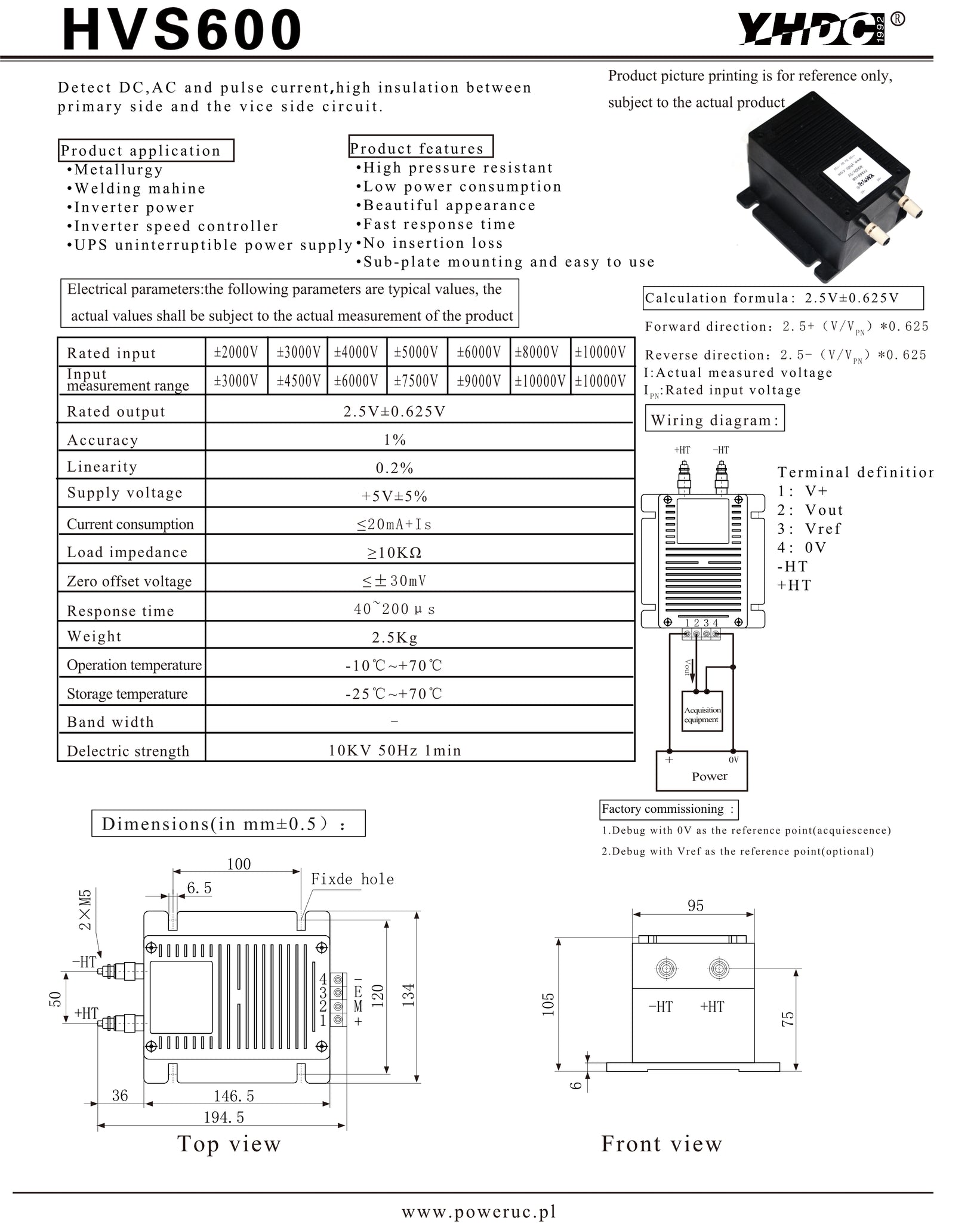 Voltage sensor HVS600 Rated input ±2000V ±3000V ±4000V ±5000V ±6000V ±8000V ±10000V Rated output 2.5V±0.625V