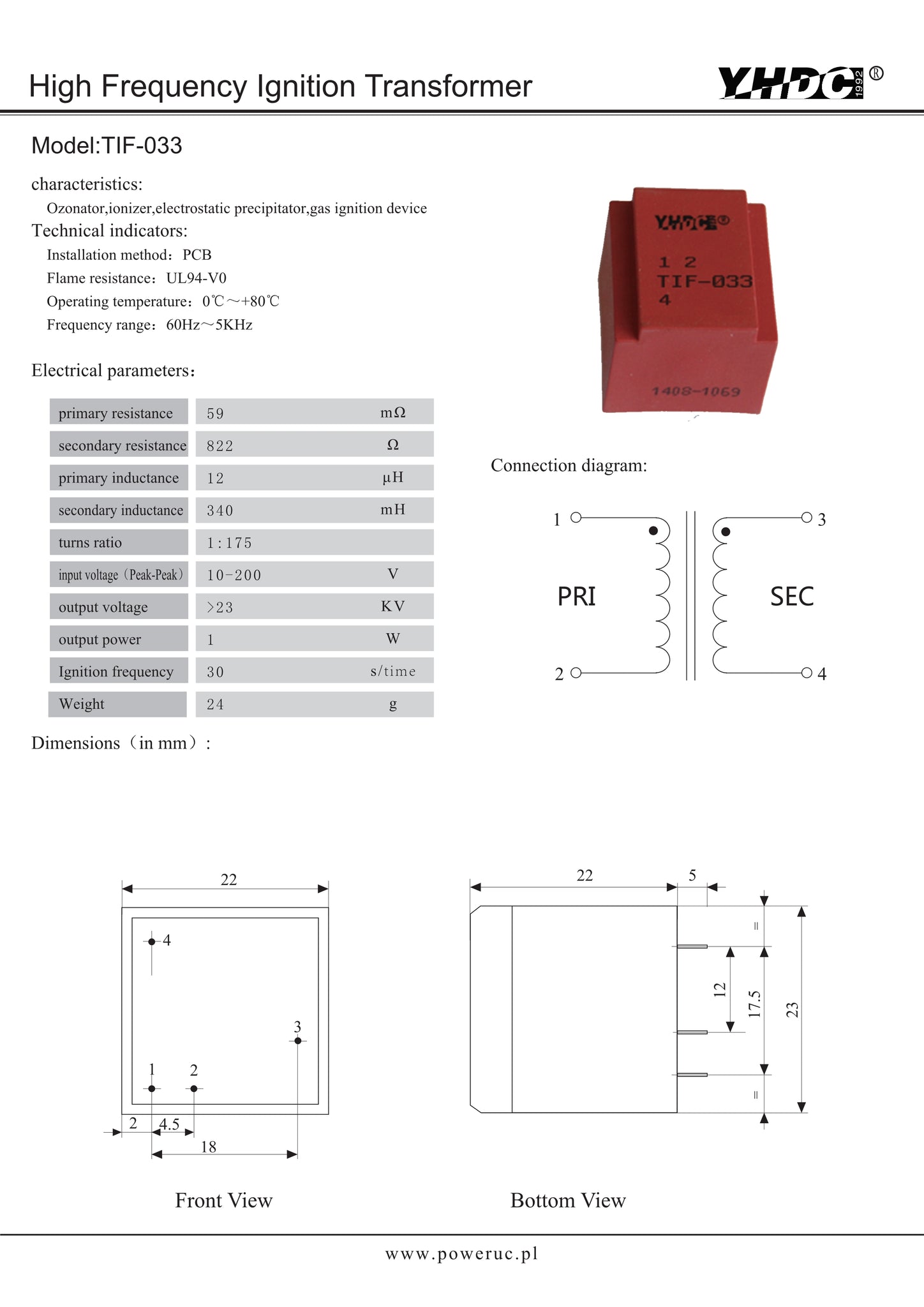 High Frequency Ignition Transformer TIF-033 primary resistance 59mΩ