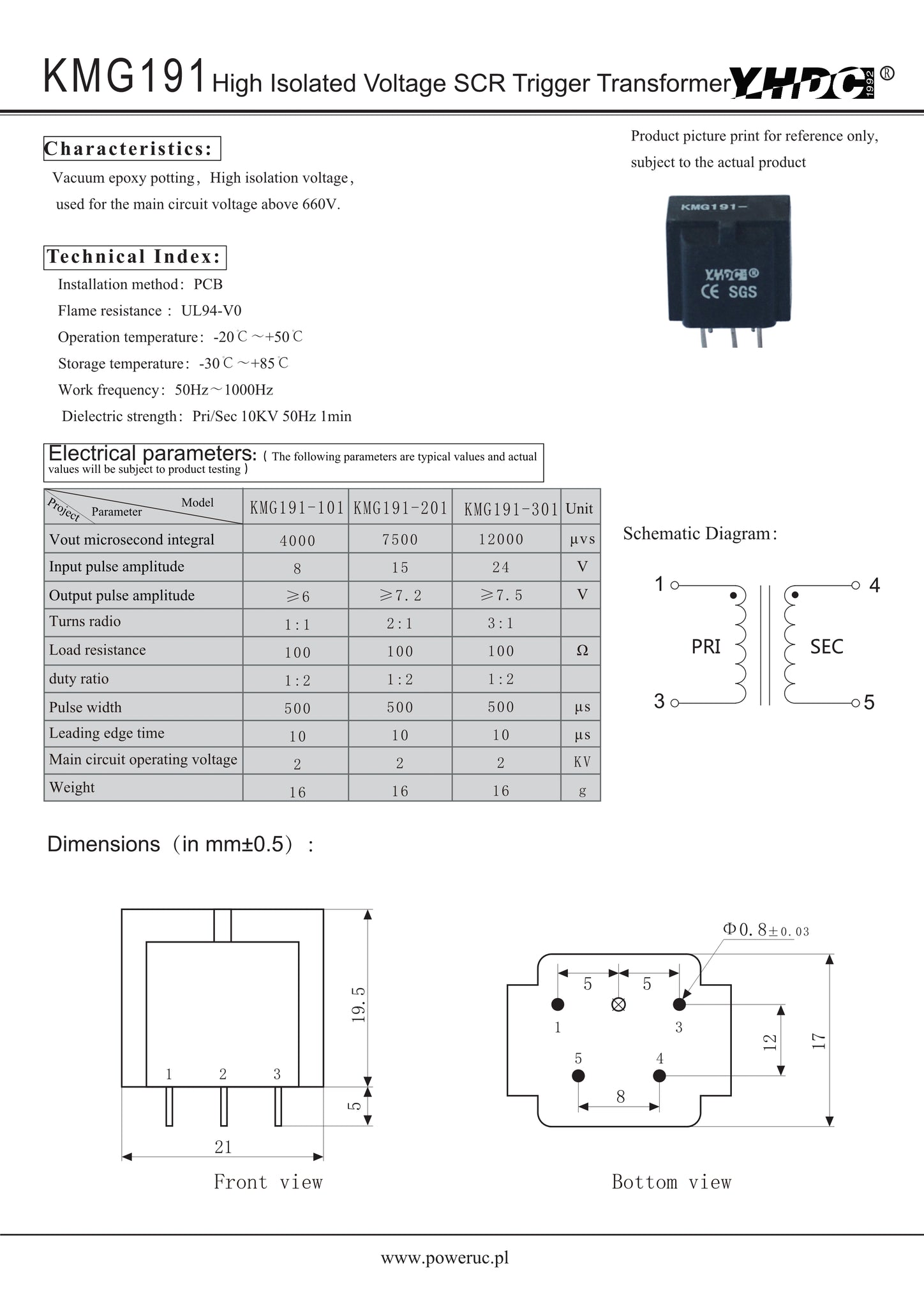 High Isolated Voltage SCR Trigger Transformer KMG191 Vout microsecond integral 4000/7500/12000μvs