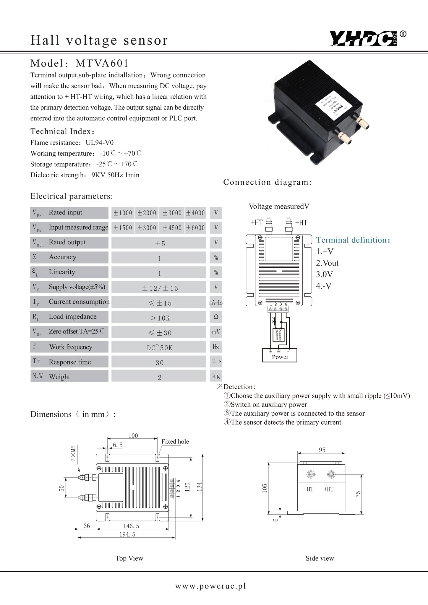 Magnetic saturation voltage sensor MTVA601 Rated input ±1000V ±2000V ±3000V ±4000V Rated output ±5V