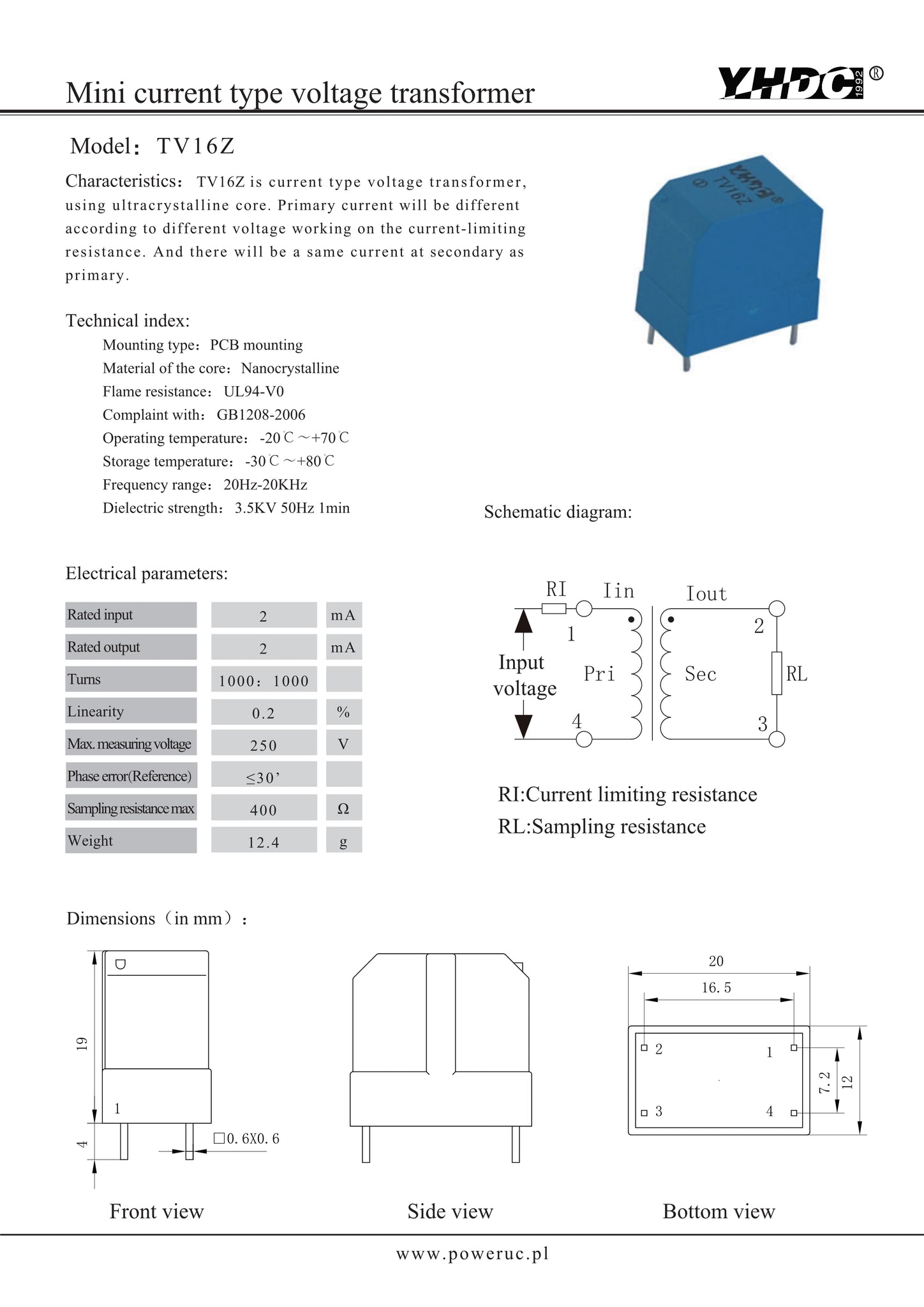 Mini current type voltage transformer TV16Z 2mA/2mA