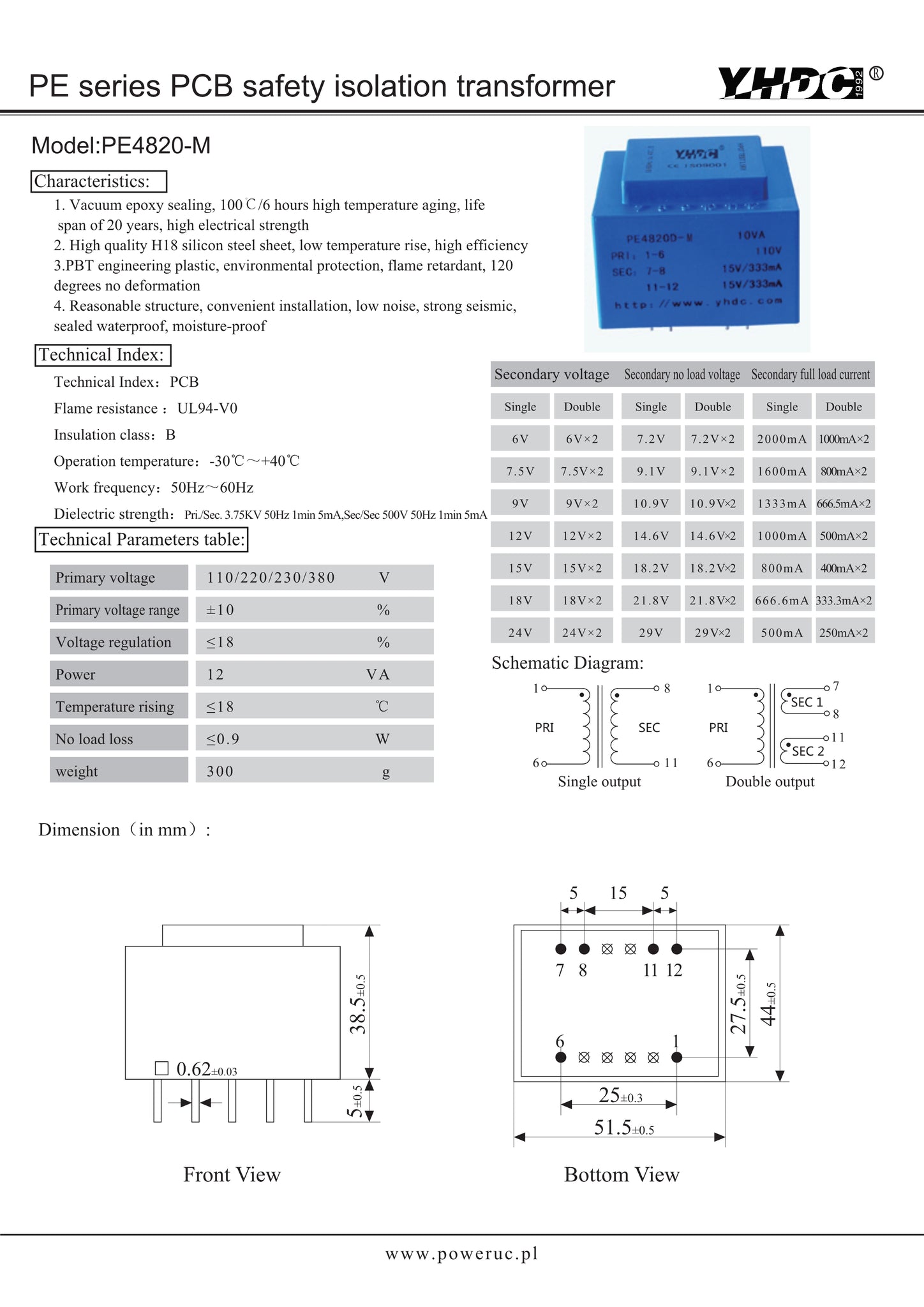 PE series PCB safety isolation transformer PE4820-M 110V/220V/230V 12VA