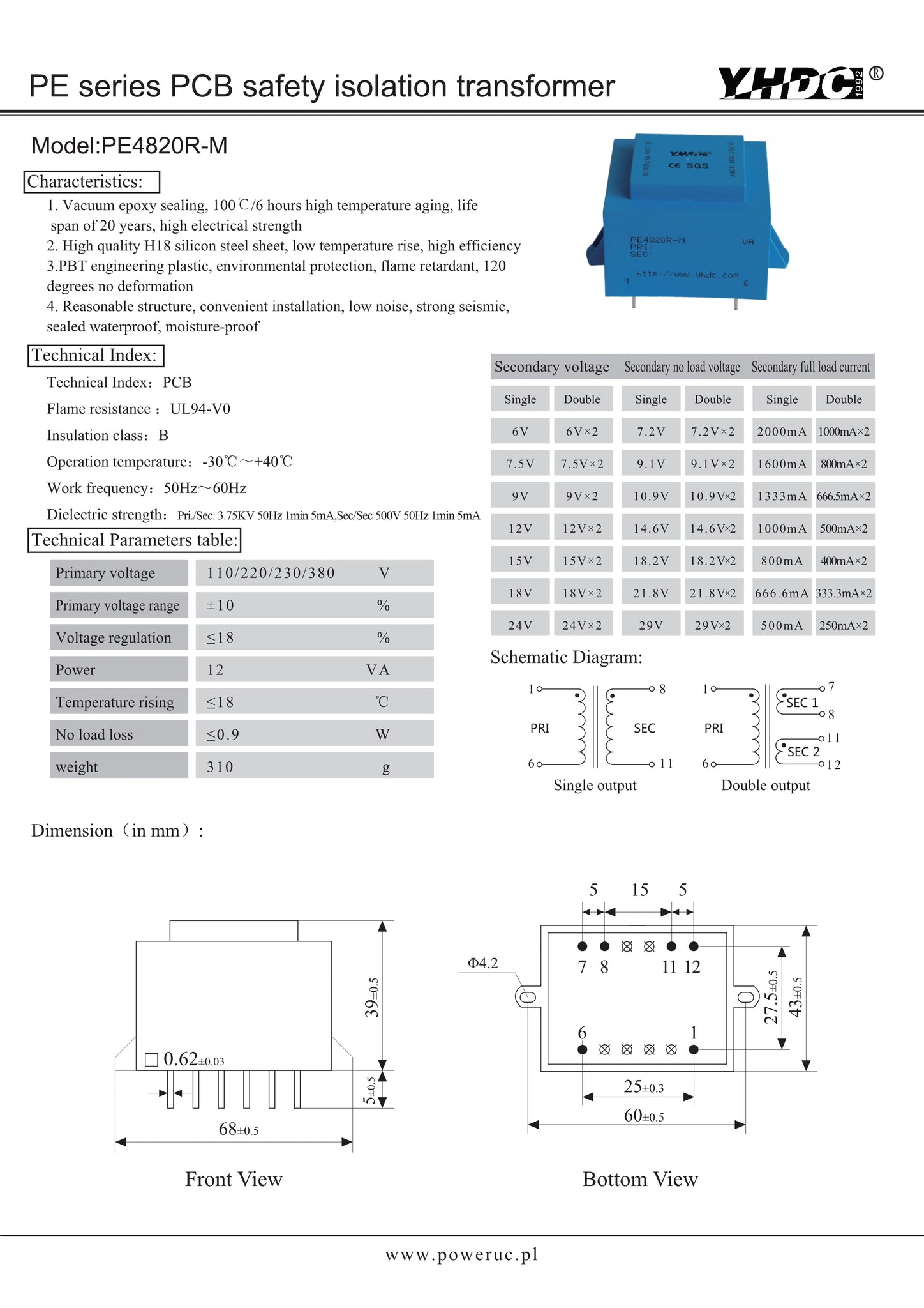 PCB safety isolation transformer PE4820R-M 110V / 220V / 230V 12VA
