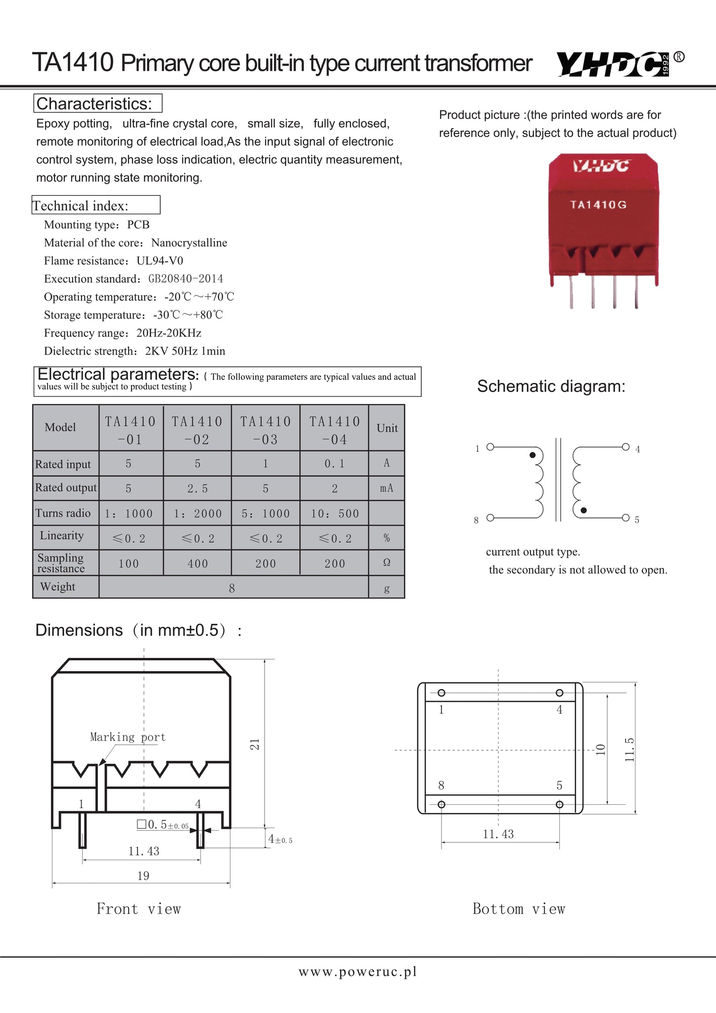 Primary core built-in type current transformer TA1410 Rated input 0-5A;0-1A;0-0.1A Rated output 0-5mA;0-2.5mA;0-2mA