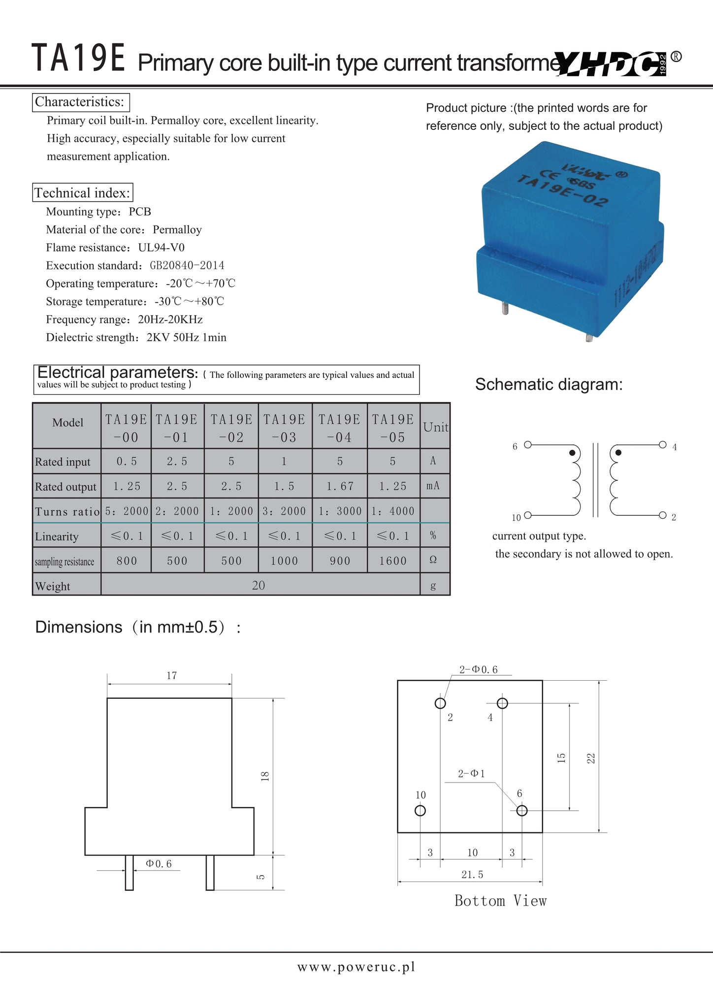 Primary core built-in type current transformer TA19E Rated input 0-0.5A;0-2.5A;0-5A;0-1A Rated output 0-1.25mA;0-2.5mA;0-1.5mA;;0-1.67mA