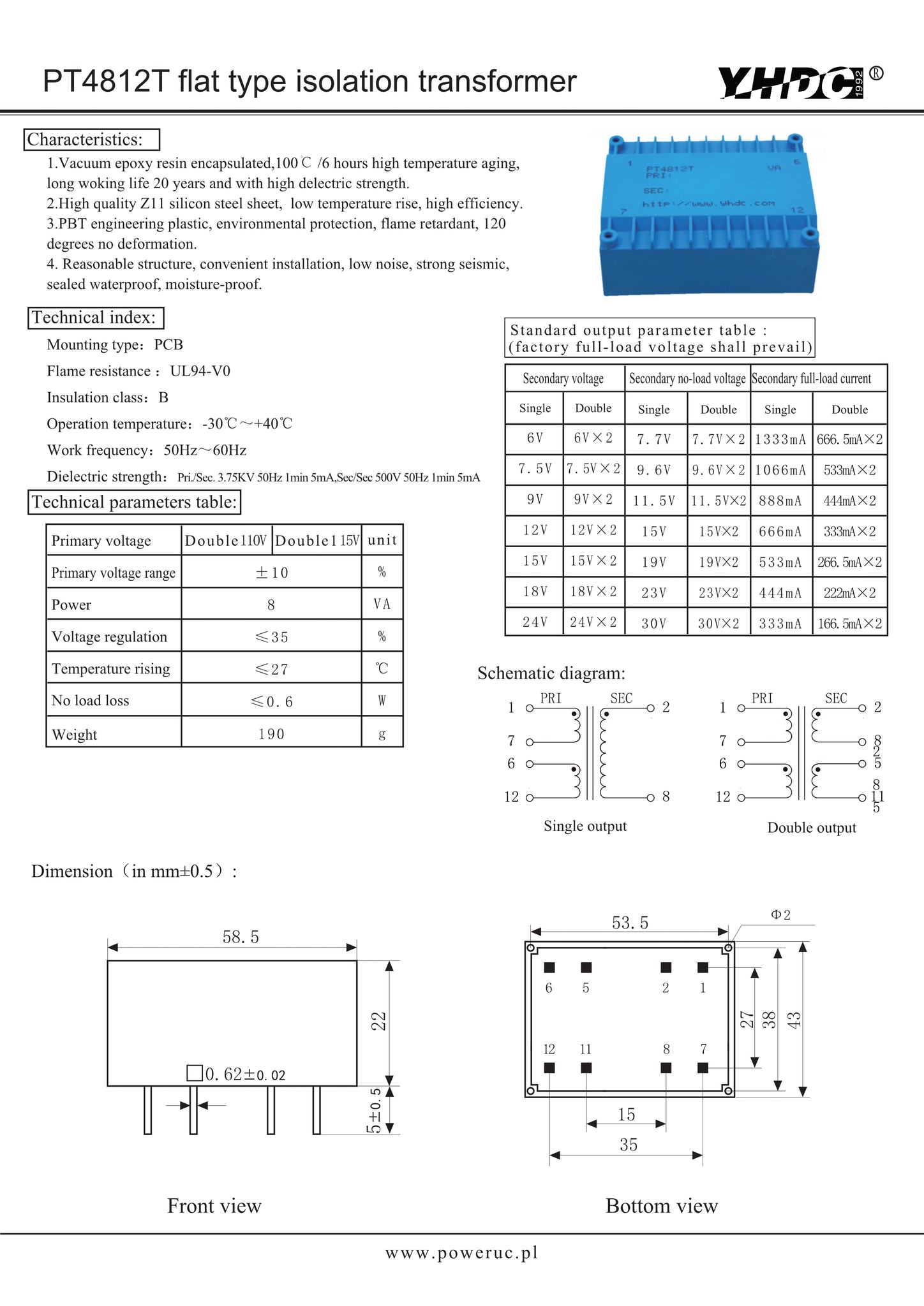 PT series flat type isolation transformer PT4812T 110V×2/115V×2 8VA