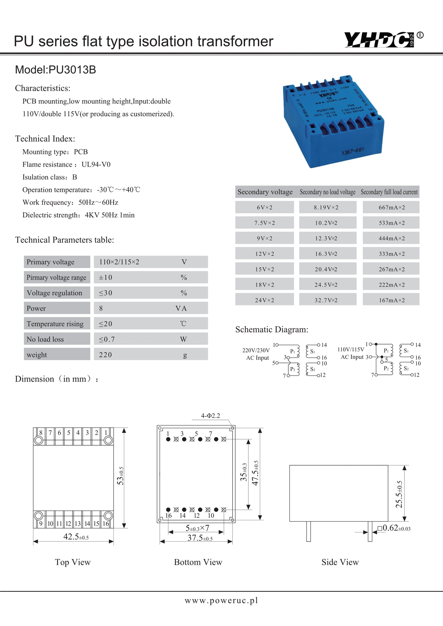 PU series flat type isolation transformer PU3013B 110V×2/115V×2 8VA