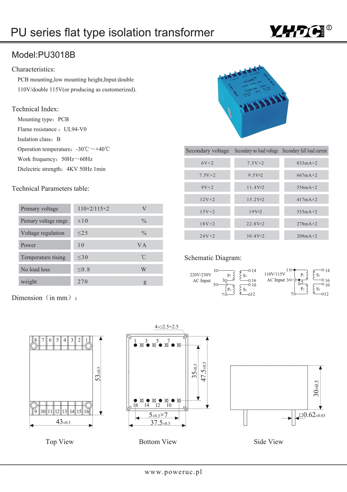 PU series flat type isolation transformer PU3018B 110V×2/115V×2 10VA