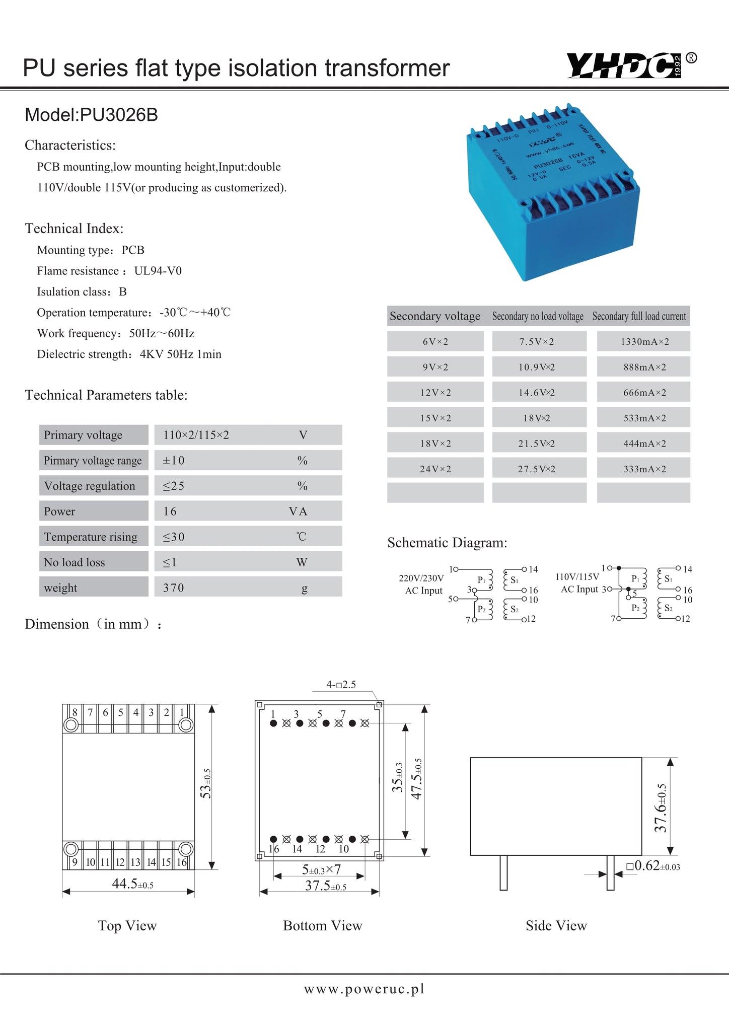 PU series flat type isolation transformer PU3026B 110V×2V/115V×2 16VA