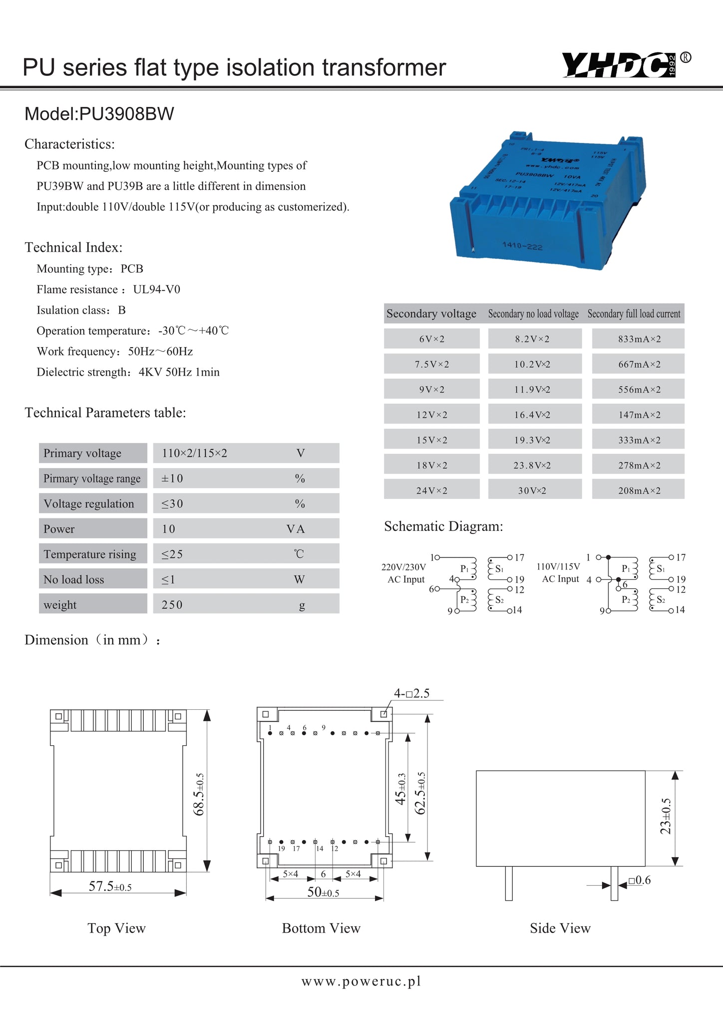 PCB mounting , low mounting height , Mounting types of PU39BW and PU39B are a little different in dimension lnput:double110V/double 115V(or producing as customerized)